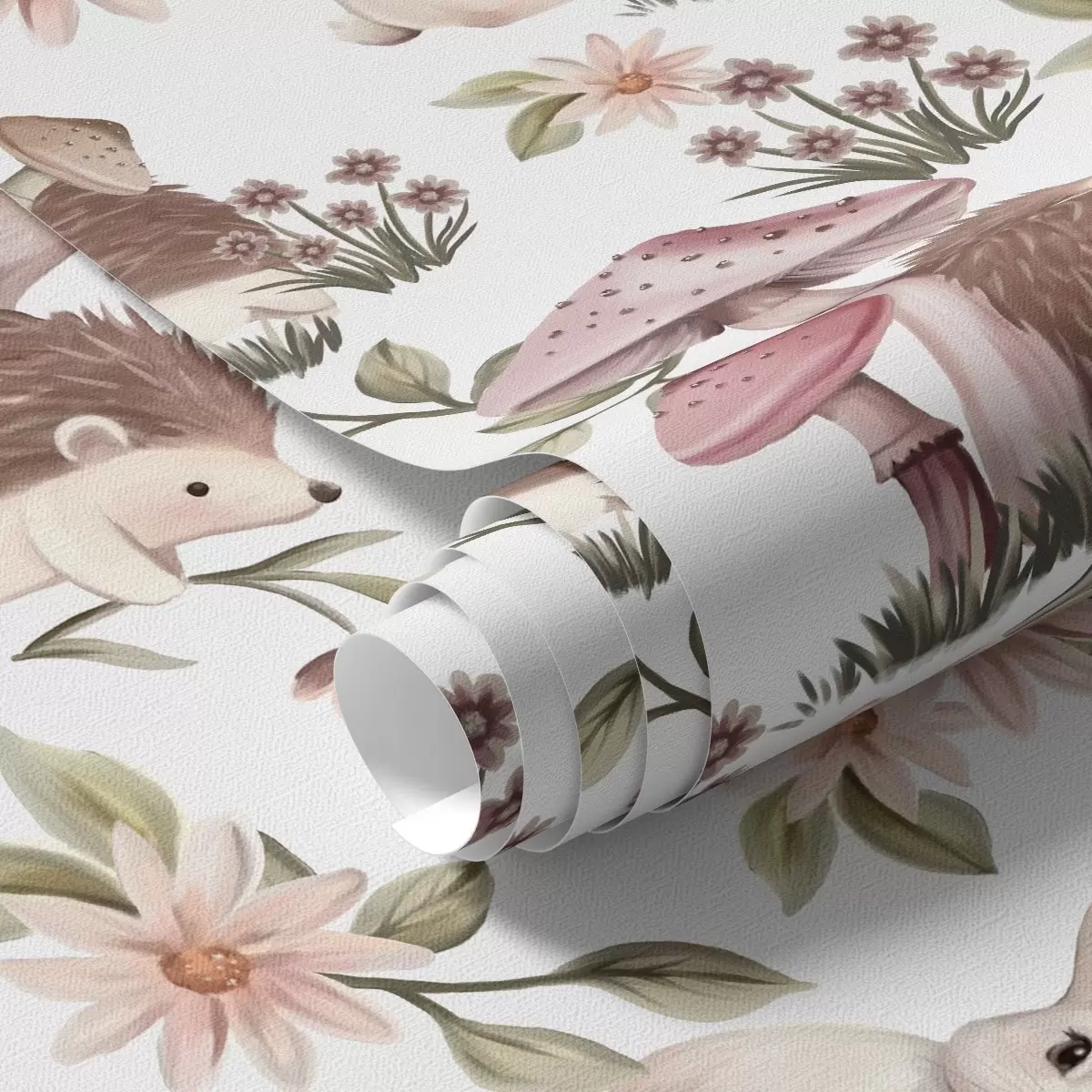 Tapéta Sünök és nyulak fehér háttéren finom virágokkal és gombákkal Nr. a00111v2