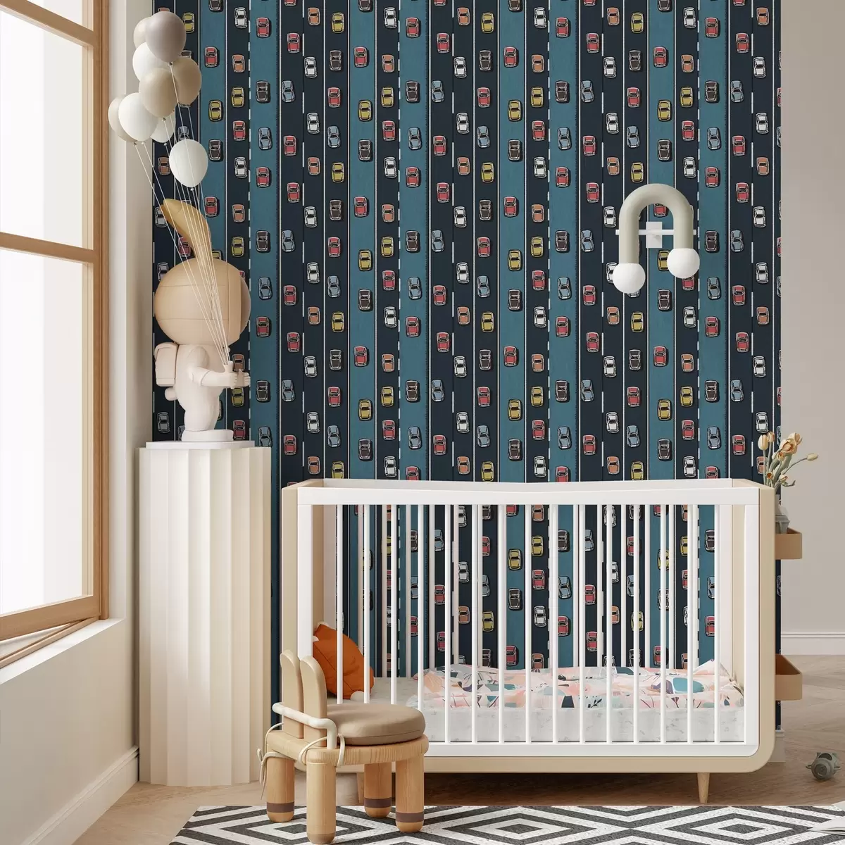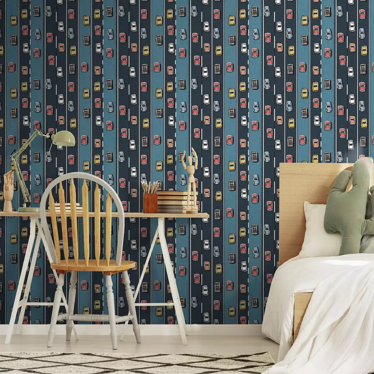 Tapéta Retro autó tengerészkék úton a 60-as évek stílusában Nr. a00118