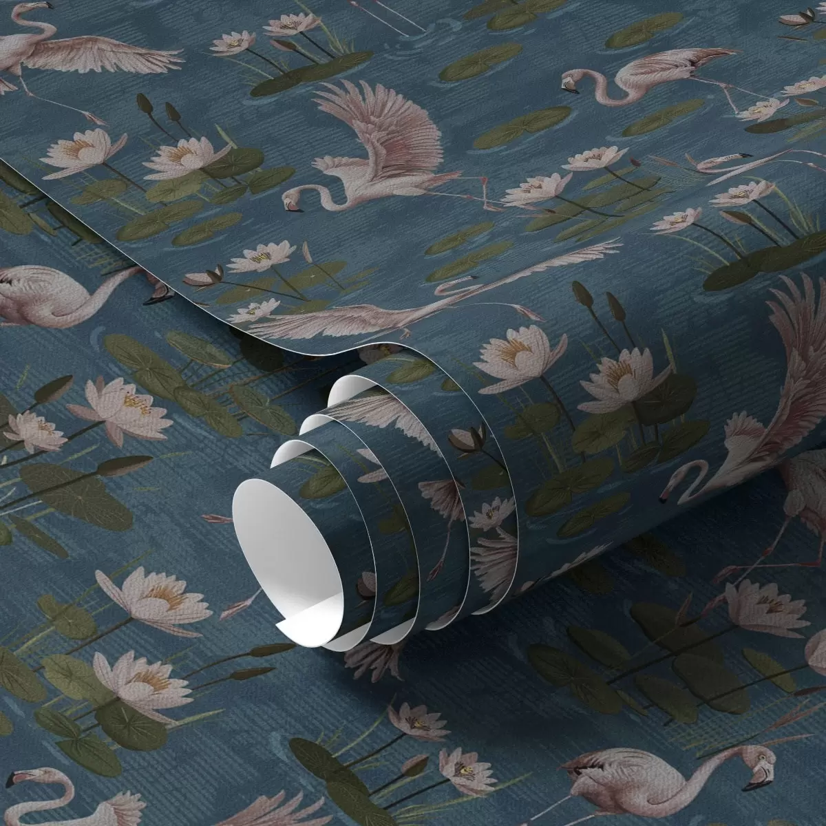 Tapéta Flamingó tavirózsák között, trópusi jelenet tengerészkék háttérrel Nr. a00237