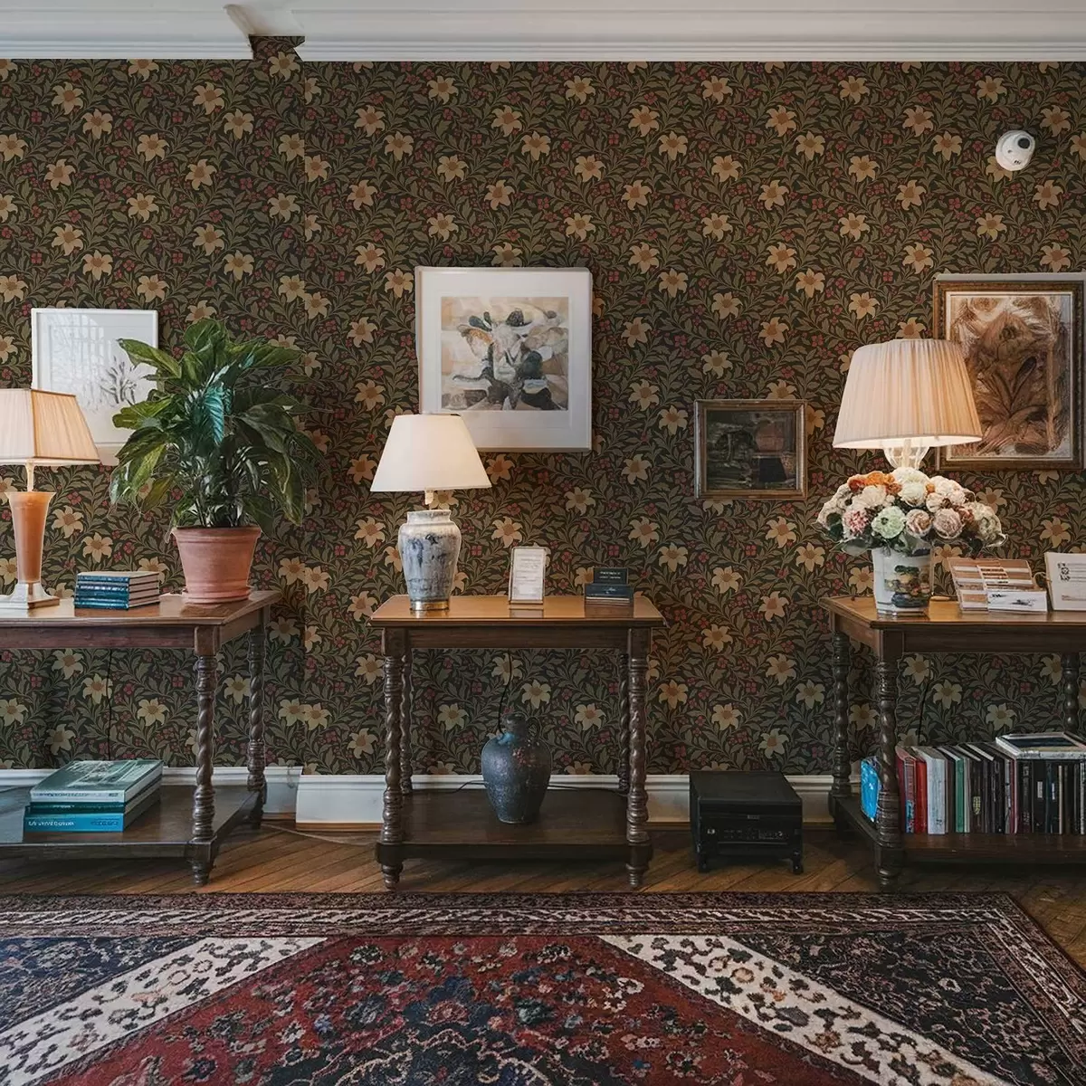 Tapéta Sötét háttér sárga és piros virágokkal szecessziós stílusban Nr. a00293