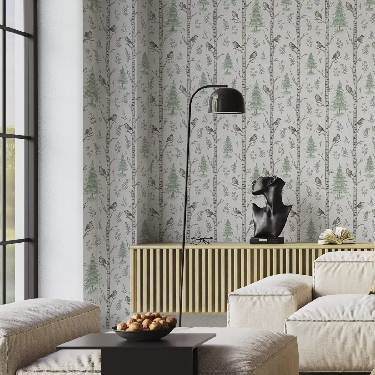 Tapéta Nyírfák madarakkal egy világoszöld erdőben Nr. a00316