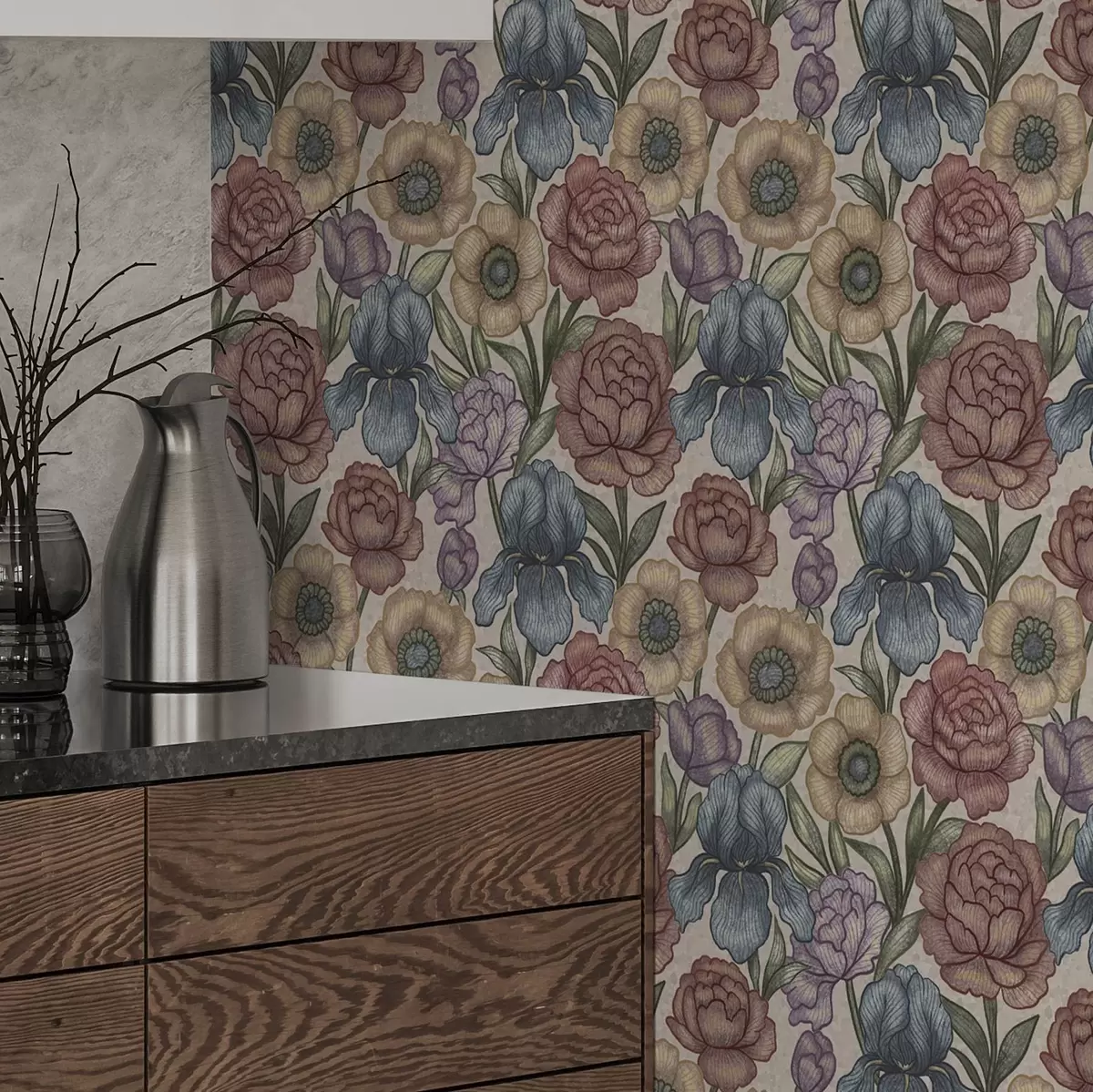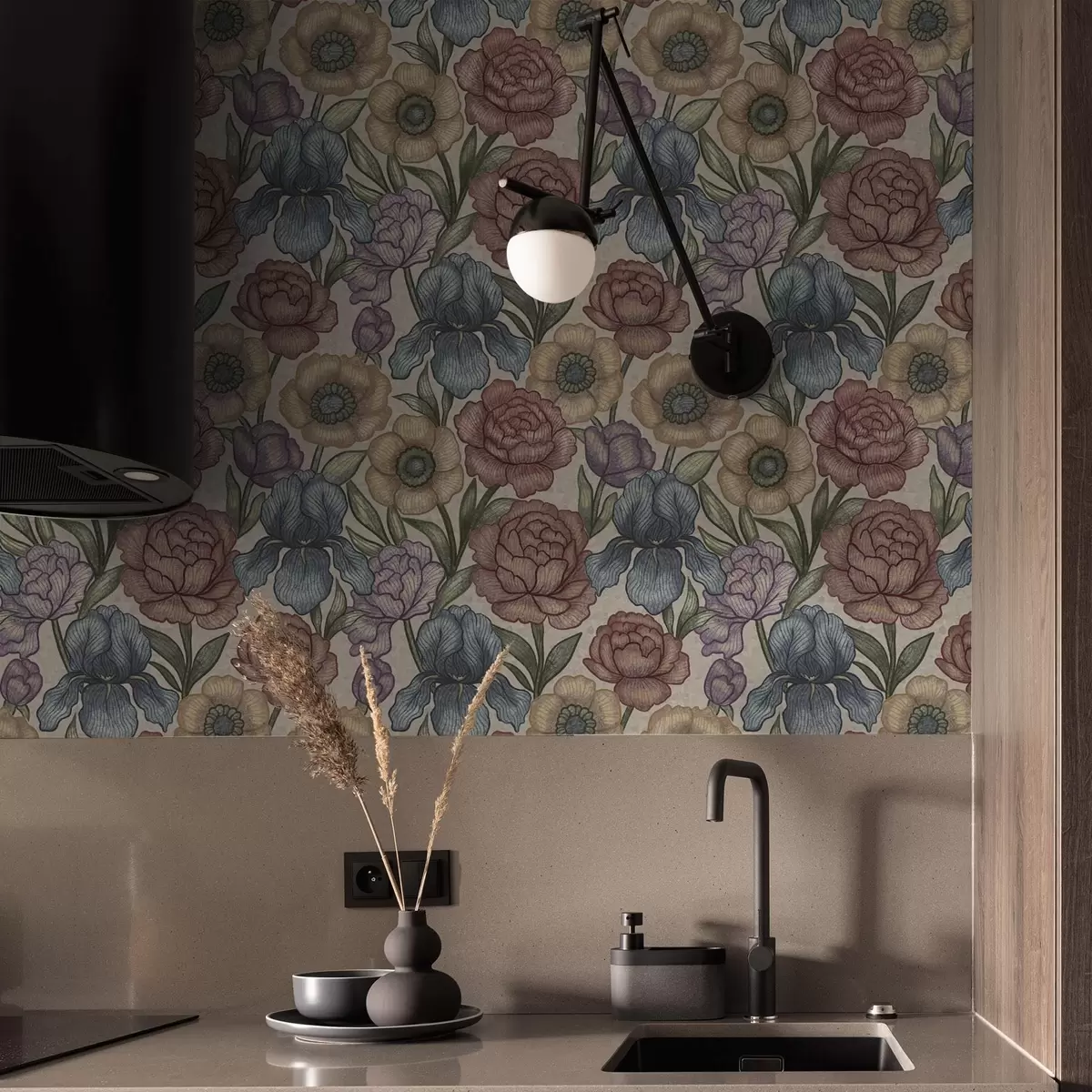 Tapéta Nagy virágos illusztrációk íriszekkel és bazsarózsákkal Nr. a00325
