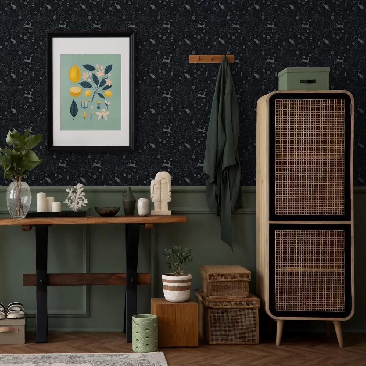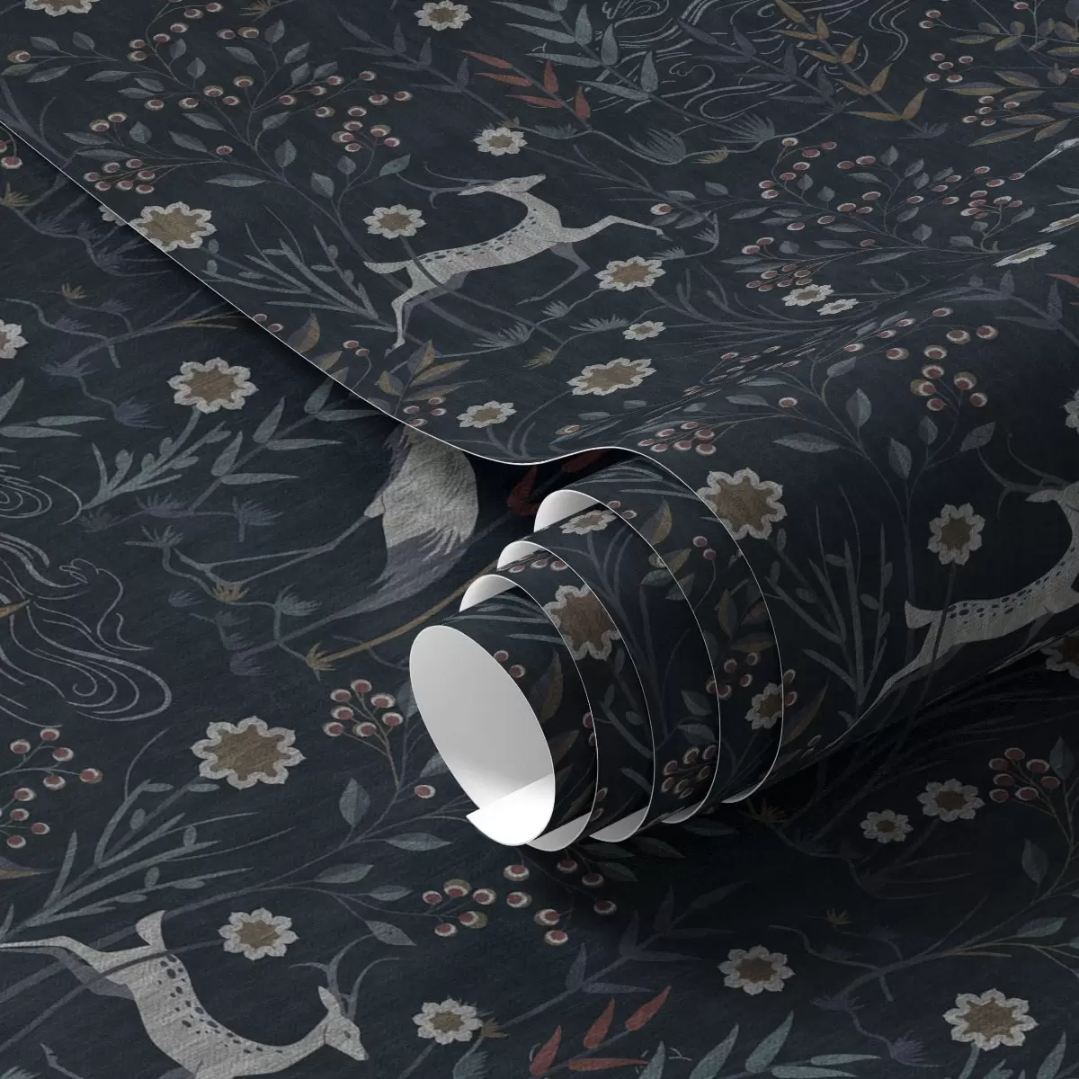 Tapéta Sötét háttér fehér madarakkal és szarvasokkal Nr. a00363