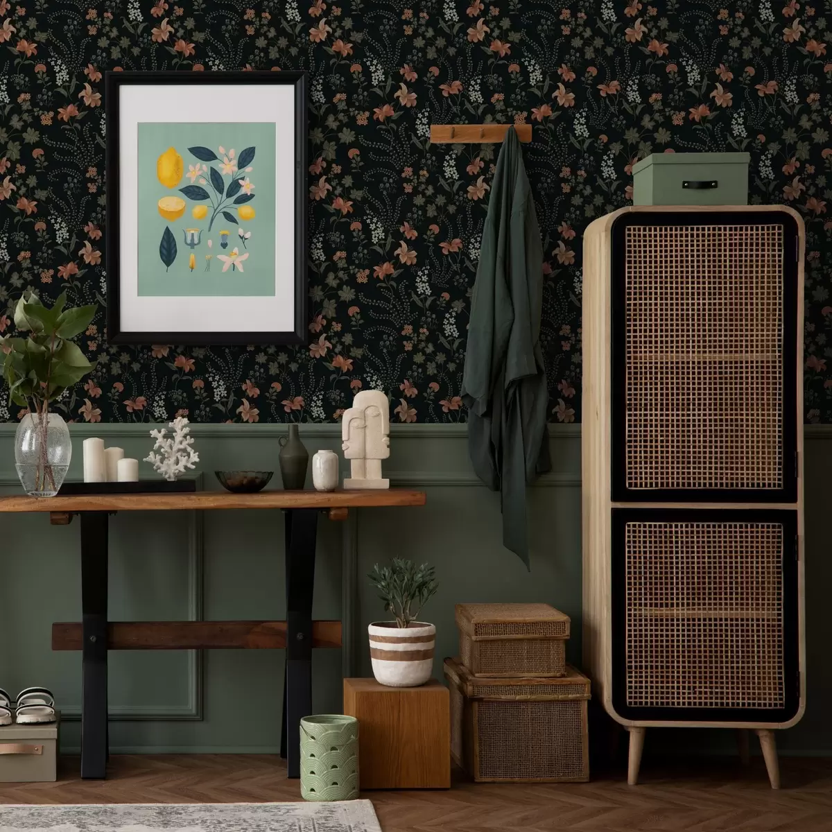 Tapéta Narancssárga liliomok és kis virágok fekete háttéren Nr. a00463