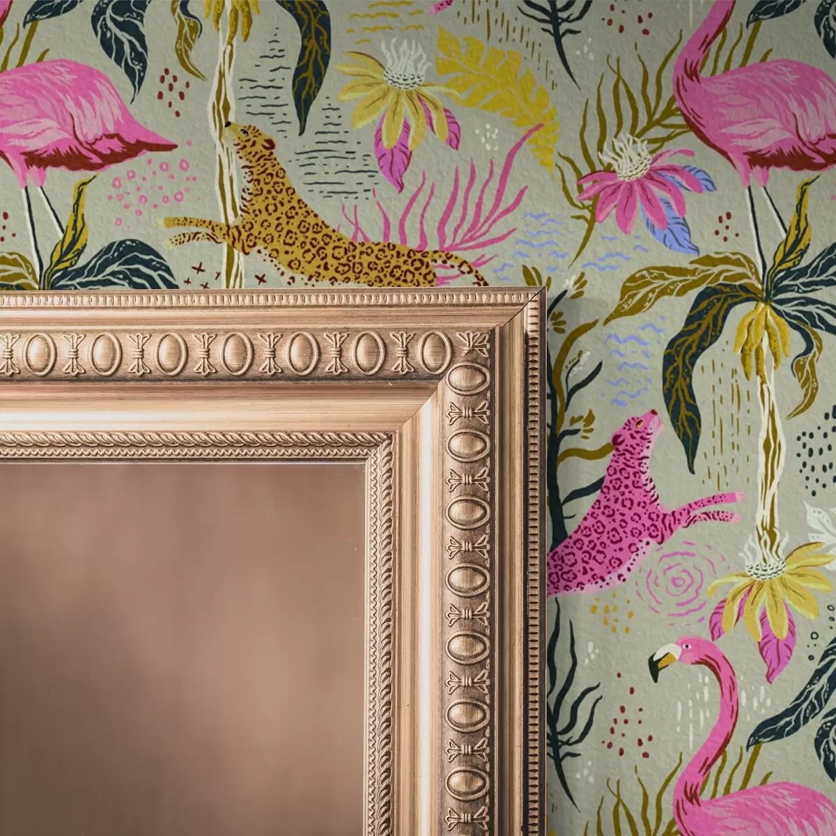 Tapéta Fényes flamingók és leopárdok a trópusi növények között Nr. a00470
