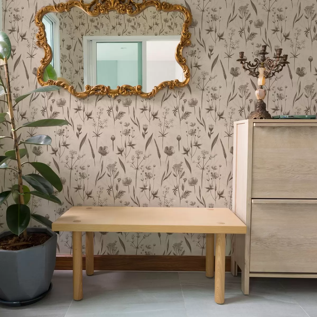 Tapéta Sárga virágok és zöldek szürkésbarna árnyalatokban Nr. a00472v1