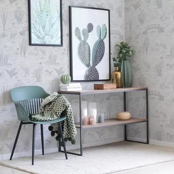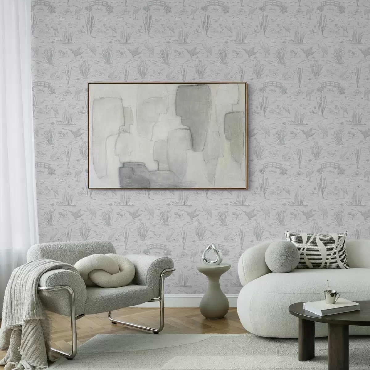 Tapéta Rajz a kócsagok és a vízinövények nyugodt szürke árnyalatokban Nr. a00479