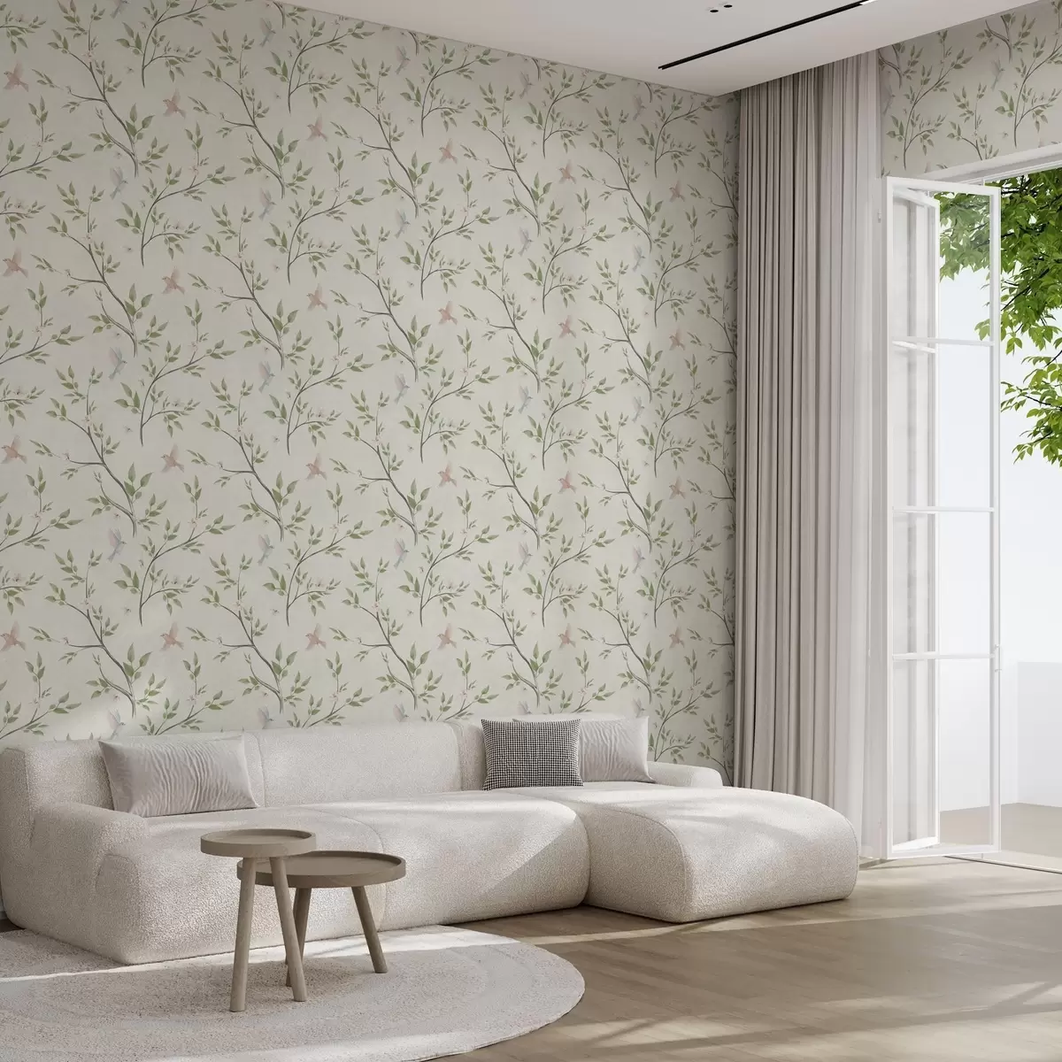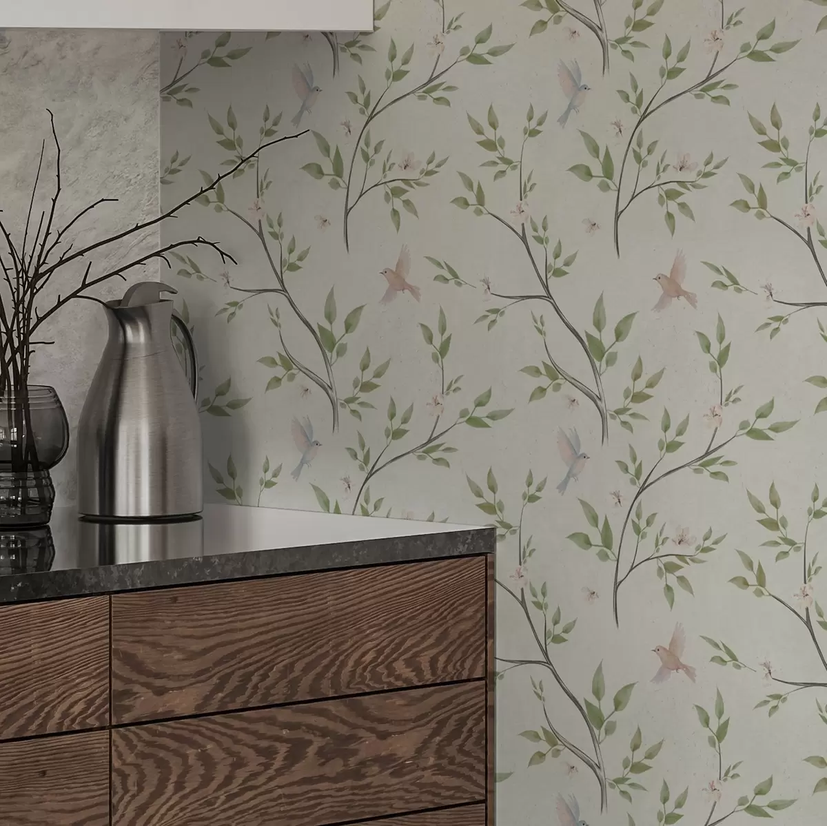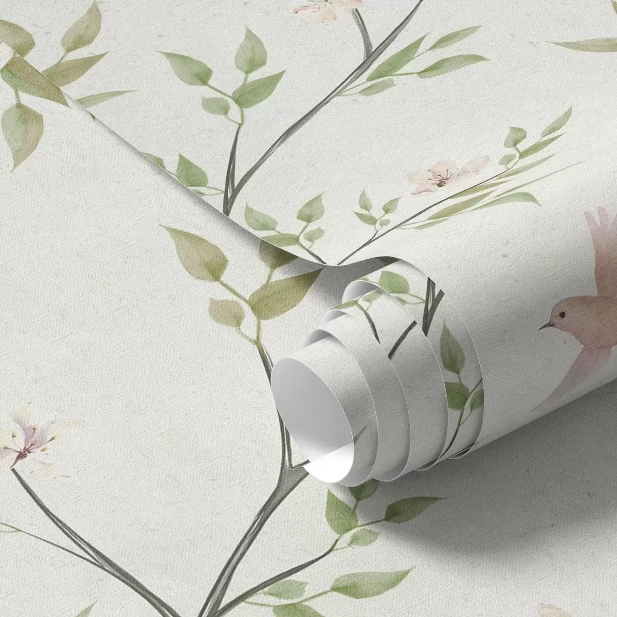 Tapéta Akvarell ágak levelekkel és madarakkal világos háttér előtt Nr. a00496
