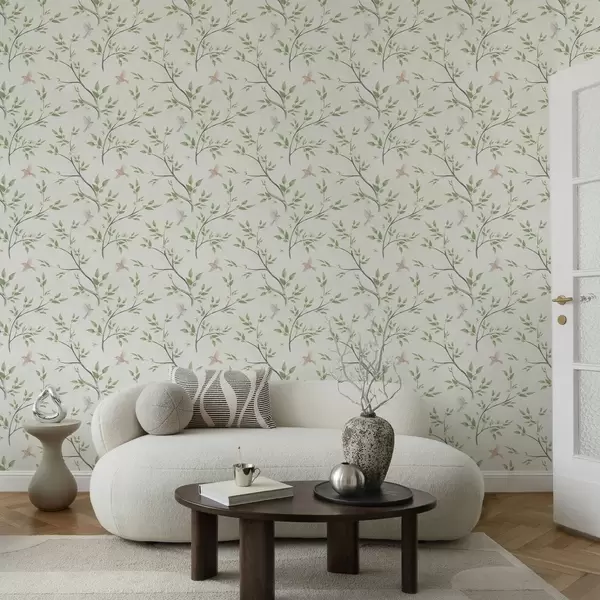 Tapéta Akvarell ágak levelekkel és madarakkal világos háttér előtt Nr. a00496