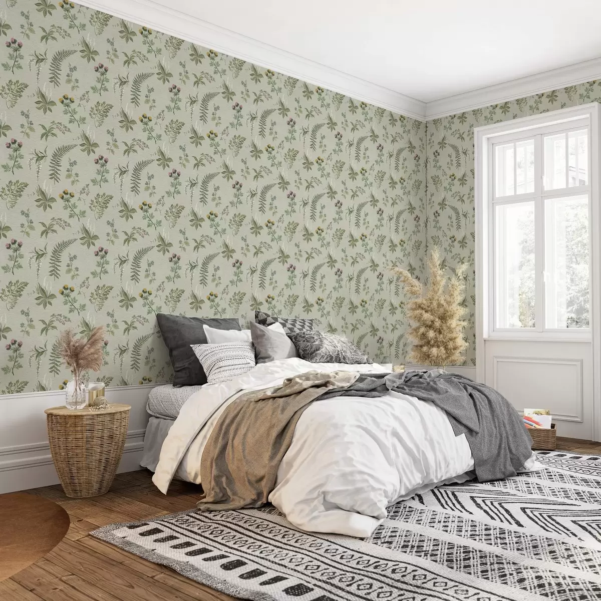 Tapéta Botanikai fűfélék és páfrányok halvány szürkés-zöld alapon Nr. a00498