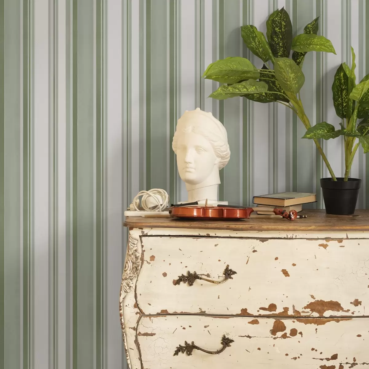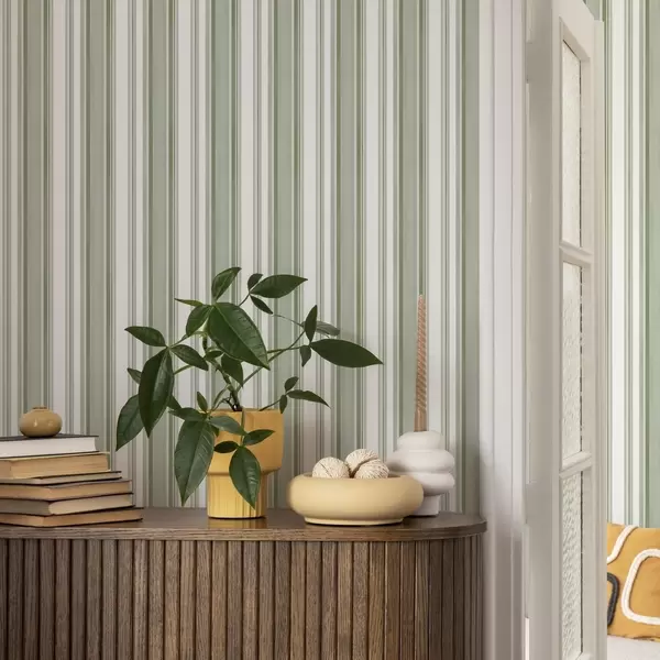 Tapéta Zöld csíkok fehér intervallumokkal és vékony vonalakkal Nr. a00526