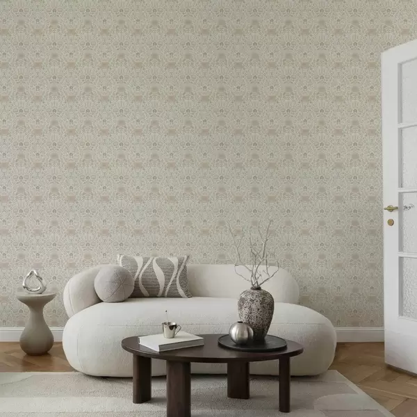 Tapéta Morris stílus: pünkösdi rózsák és fűszernövények lágy bézs-zöld színekben Nr. a00581