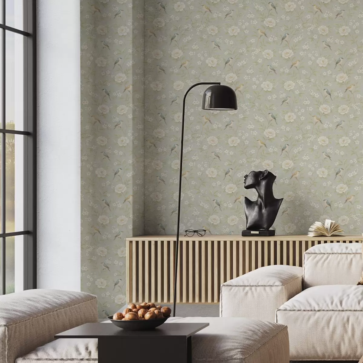 Tapéta Madarak fehér virágok között szürkés-zöld háttér előtt Nr. a00583