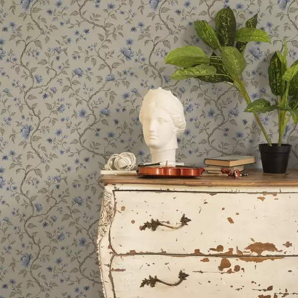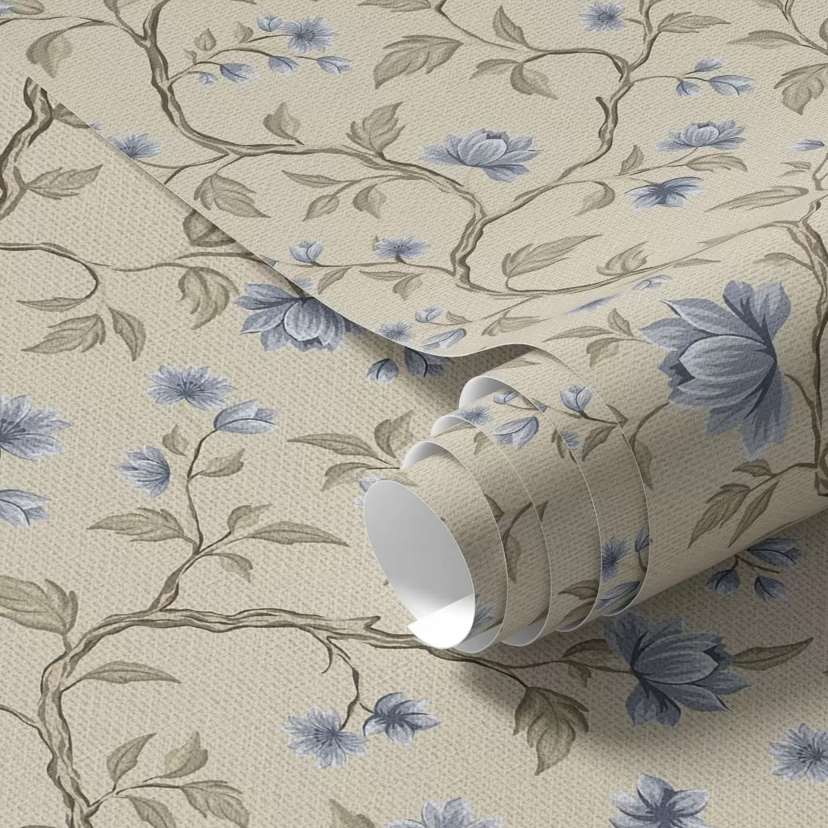 Tapéta Kék virágos ágak lenvászon bézs háttérrel Nr. a00590