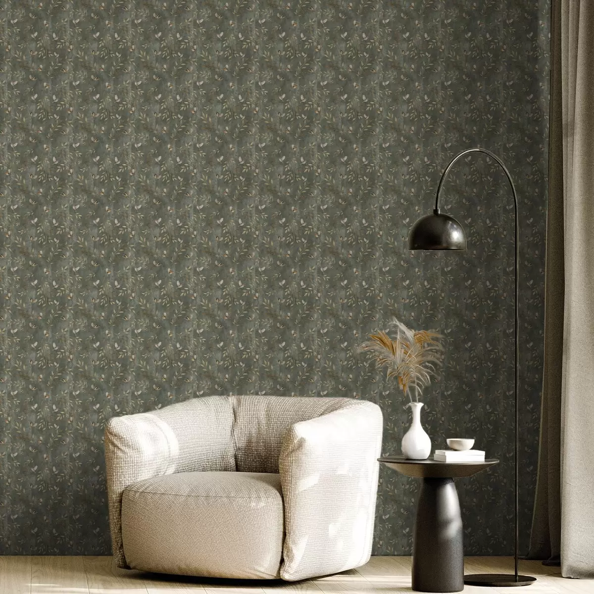Tapéta Madarak narancssárga lombok között, mélyzöld háttér előtt Nr. a00591