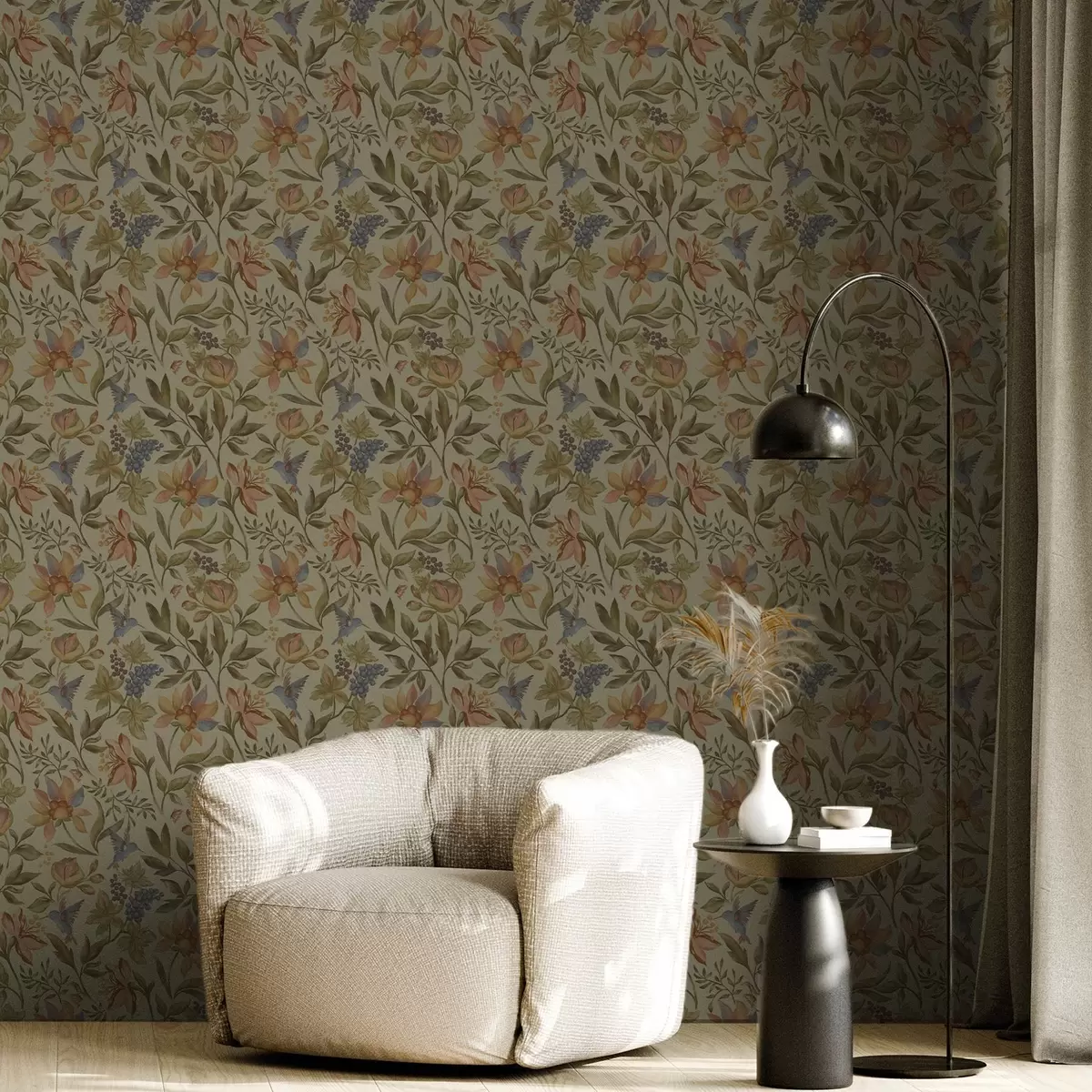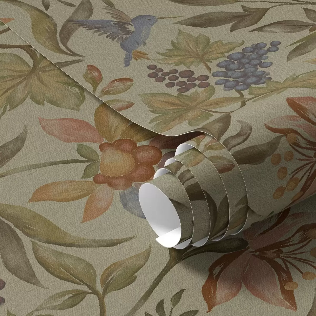 Tapéta Vintage virágok és madarak szőlővel olíva háttérrel Nr. a00594
