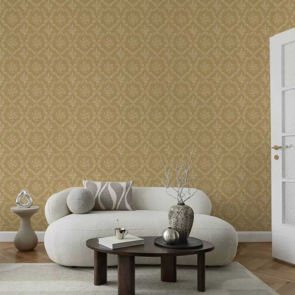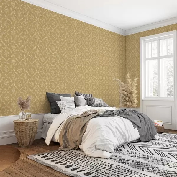 Tapéta Fehér gyógynövény- és virágkoszorúk mustárszínű alapon Nr. a00599