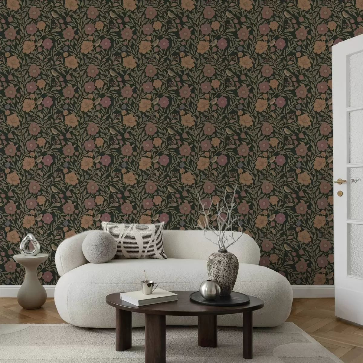 Tapéta Őszi virágok és madarak mély smaragd zöld háttér előtt Nr. a00605v1