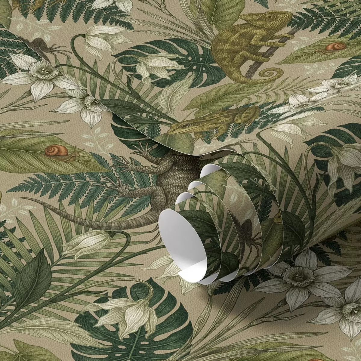 Tapéta Kaméleonok és trópusi levelek, fehér virágok, bézs alap Nr. a00608