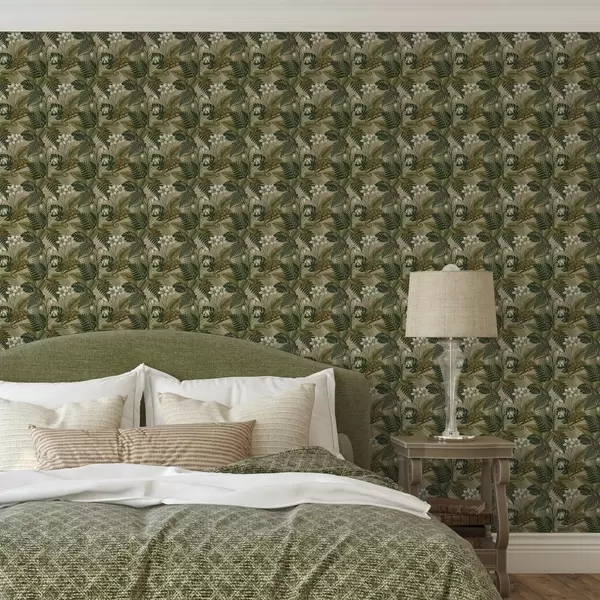 Tapéta Kaméleonok és trópusi levelek, fehér virágok, bézs alap Nr. a00608