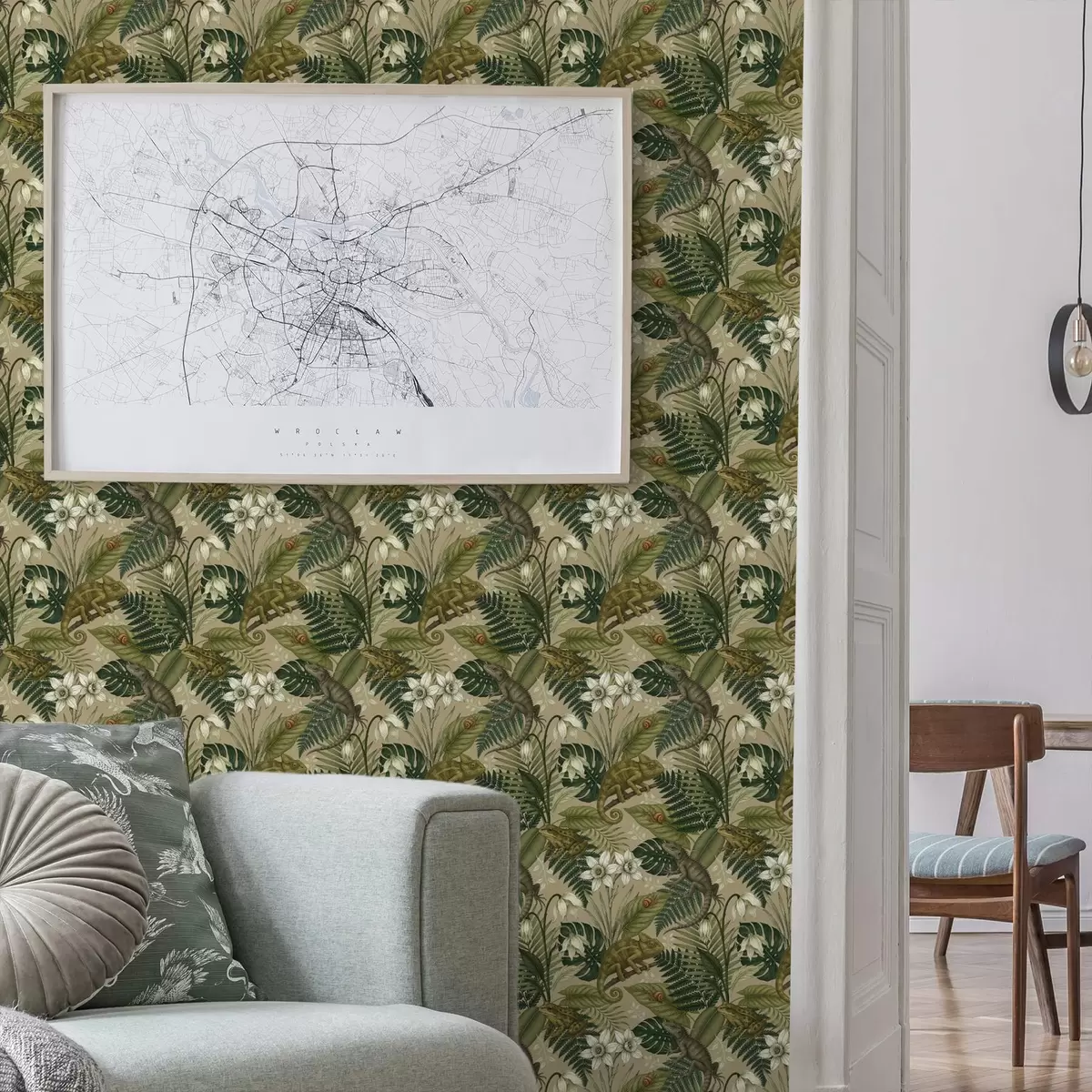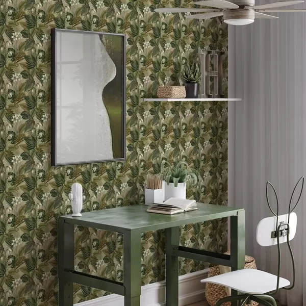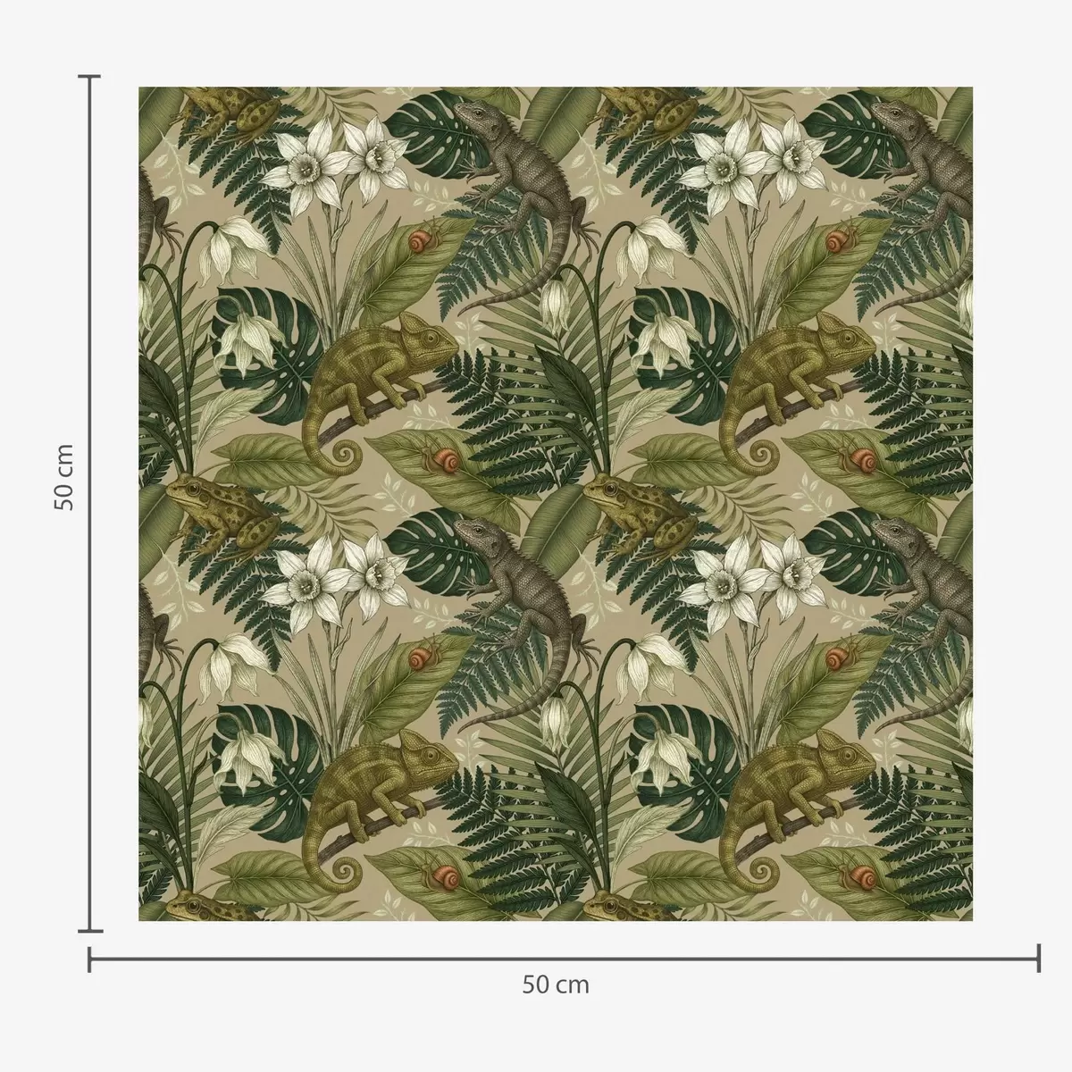 Tapéta Kaméleonok és trópusi levelek, fehér virágok, bézs alap Nr. a00608