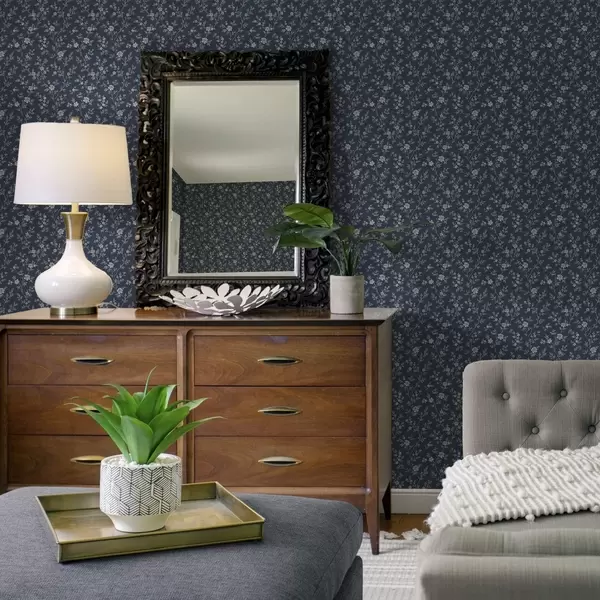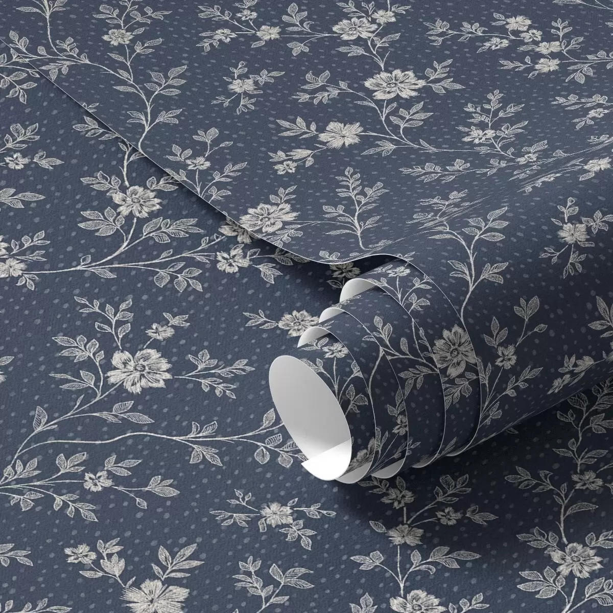 Tapéta Sötétkék háttér, vékony bézs ágakkal és virágokkal Nr. a00612