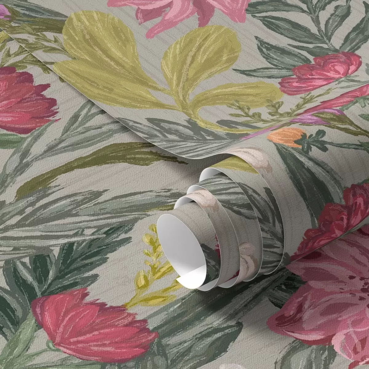Tapéta Pompás rózsaszín és krém színű virágok szürke háttér előtt, impasto textúrával Nr. a00629