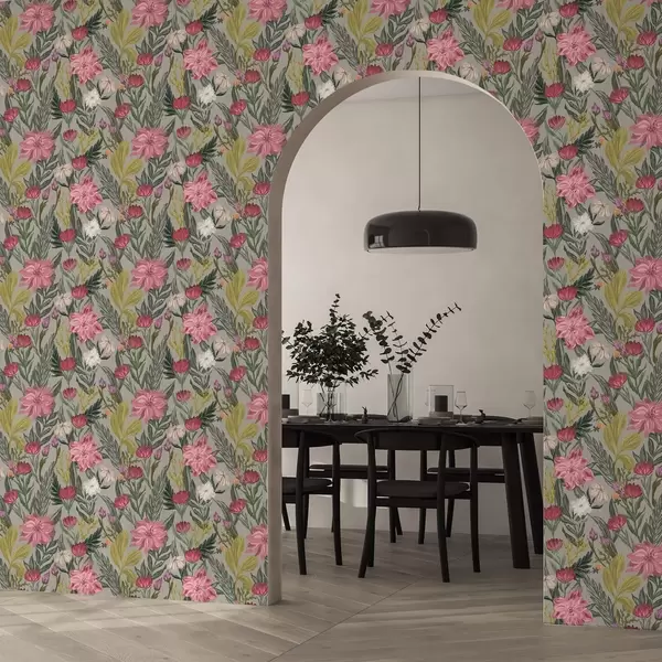 Tapéta Pompás rózsaszín és krém színű virágok szürke háttér előtt, impasto textúrával Nr. a00629