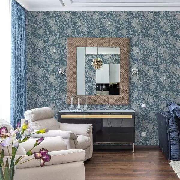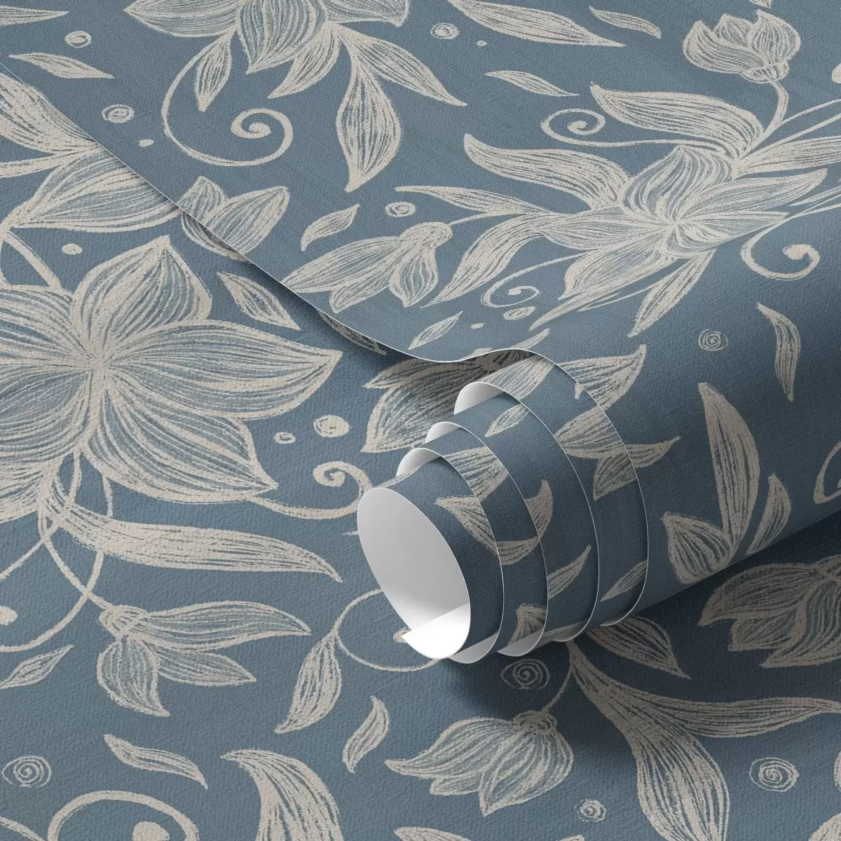Tapéta Kék háttérrel krém színű lineáris virágok, finom tekercsek Nr. a00630