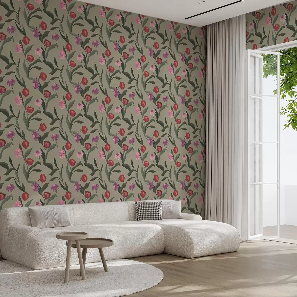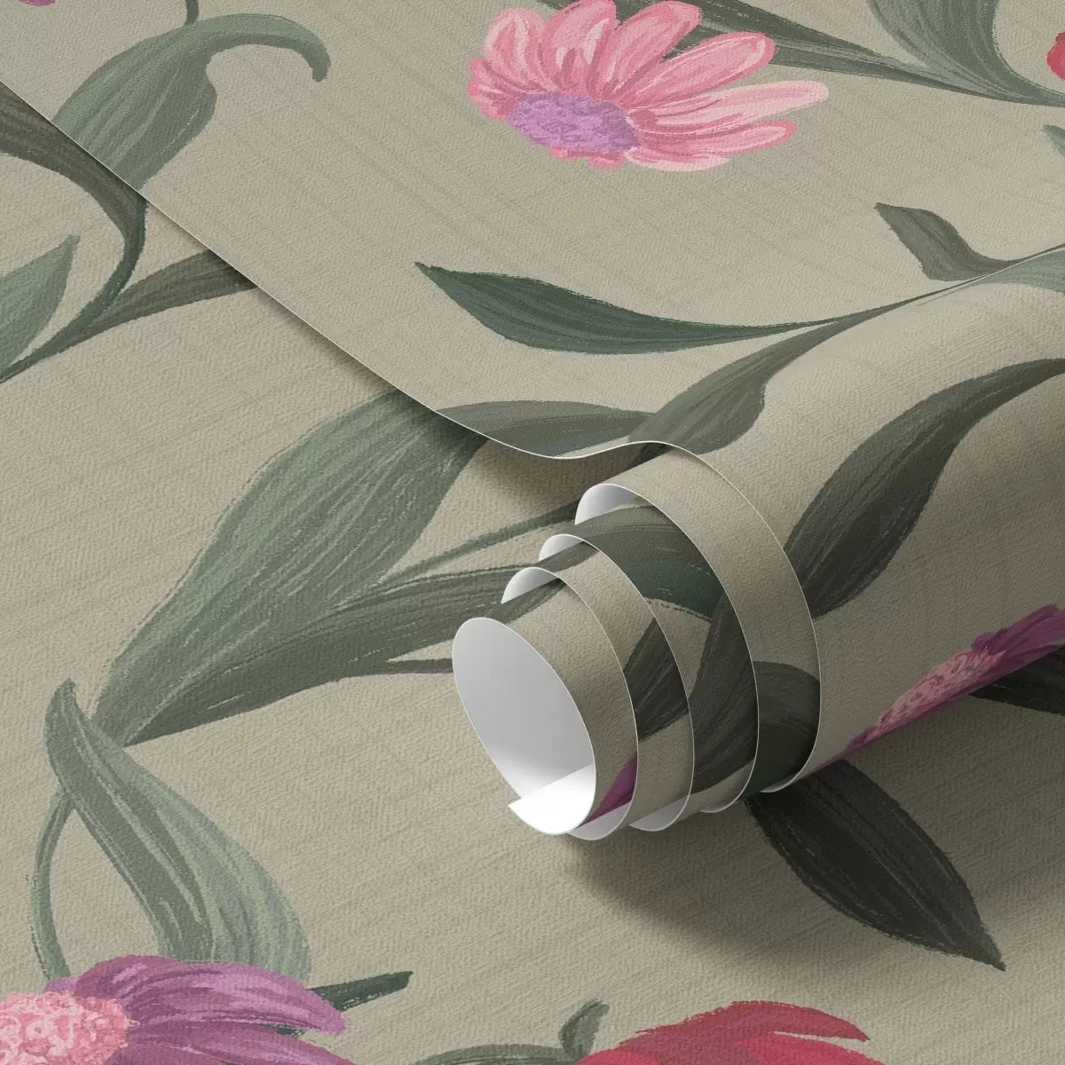 Tapéta Rózsaszín-vörös virágok olíva háttérrel, vászon textúra Nr. a00631v1
