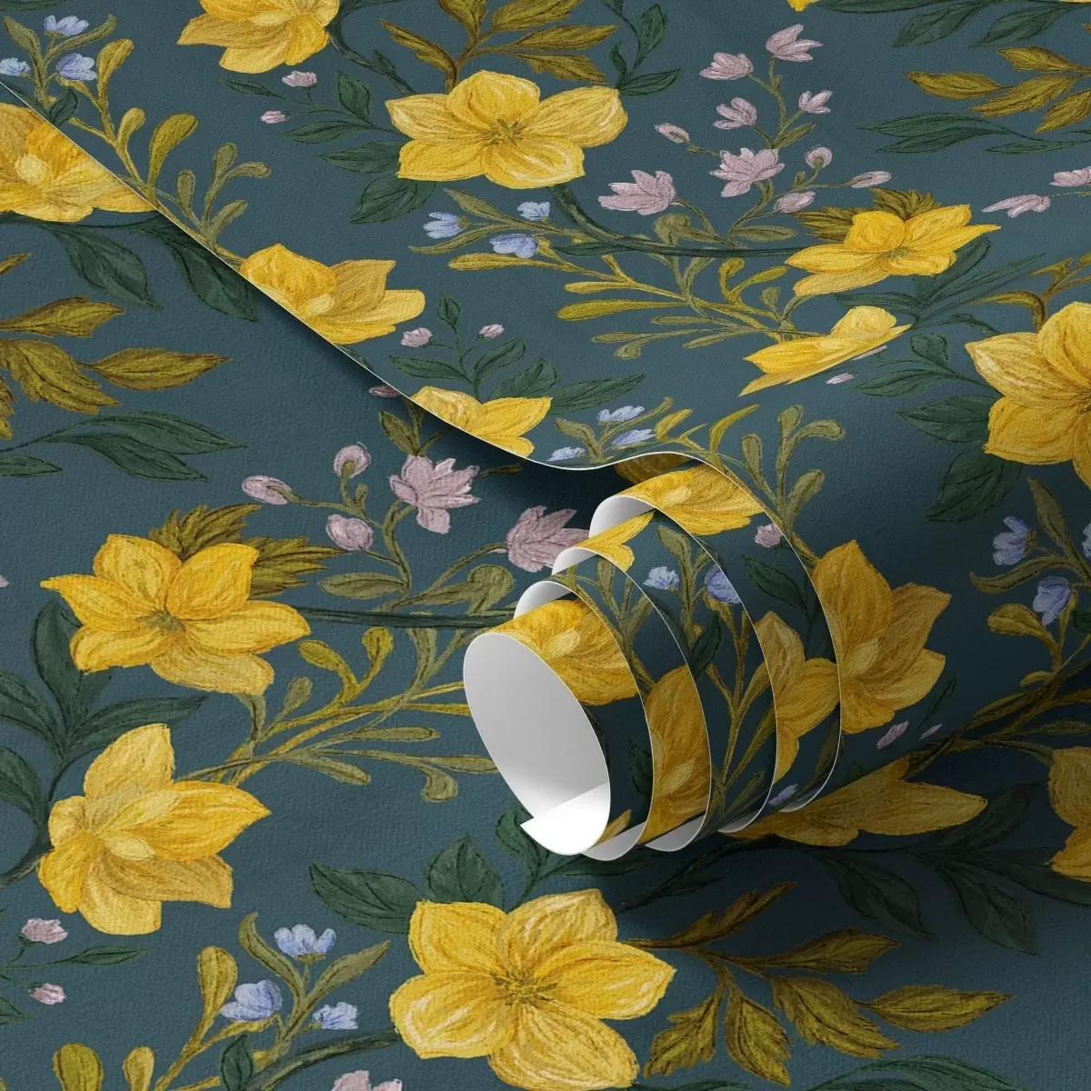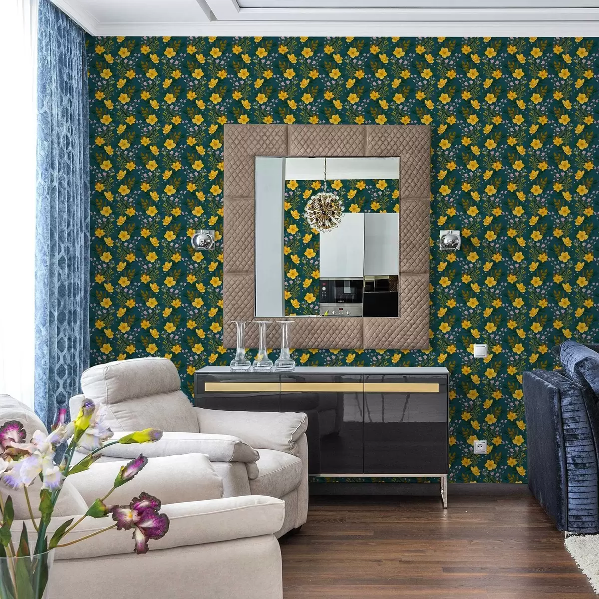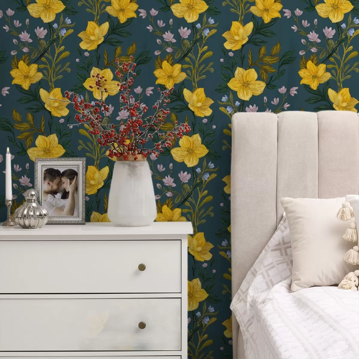Tapéta Sötétkék háttér előtt függőleges füzérben elrendezett sárga virágok Nr. a00632v2