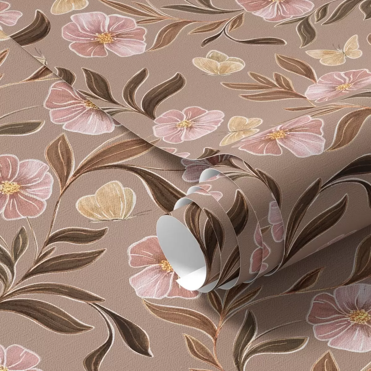 Tapéta Rózsaszín virágok és pillangók meleg barna háttér előtt Nr. a00633v1