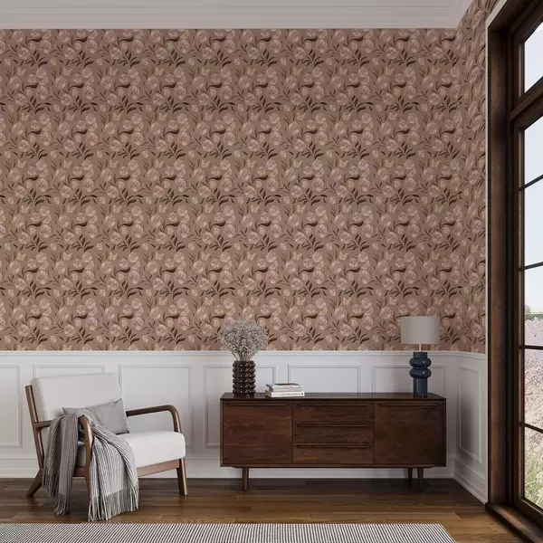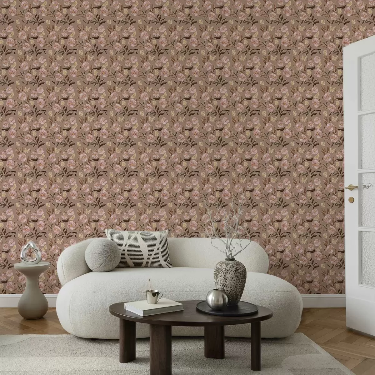 Tapéta Rózsaszín virágok és pillangók meleg barna háttér előtt Nr. a00633v1