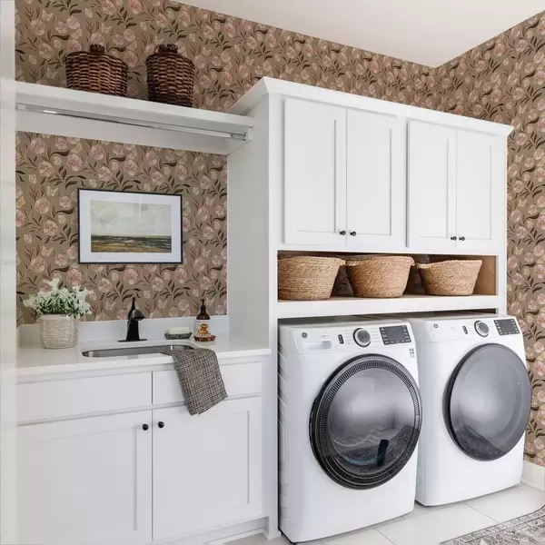 Tapéta Rózsaszín virágok és pillangók olíva-bézs háttér előtt Nr. a00633v2