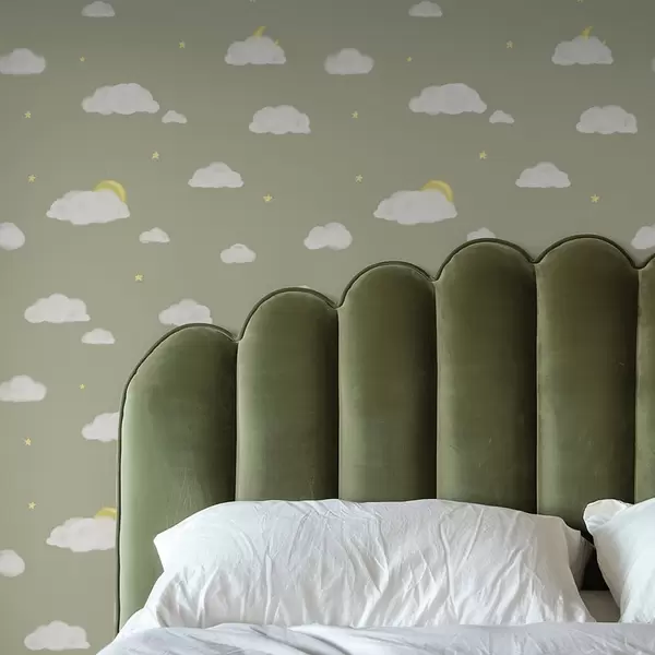 Tapéta Puha felhők, csillagok és nap zöldesszürke háttér előtt Nr. a00652v1