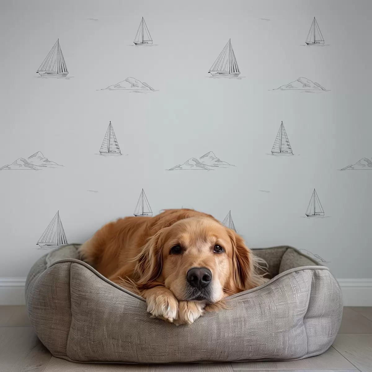 Tapéta Vázlatos jachtok és szigetek, hűvös kékesszürke háttér Nr. a00654