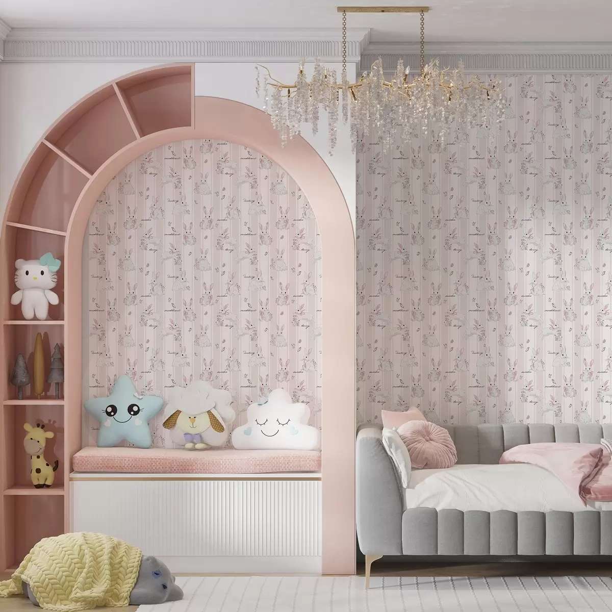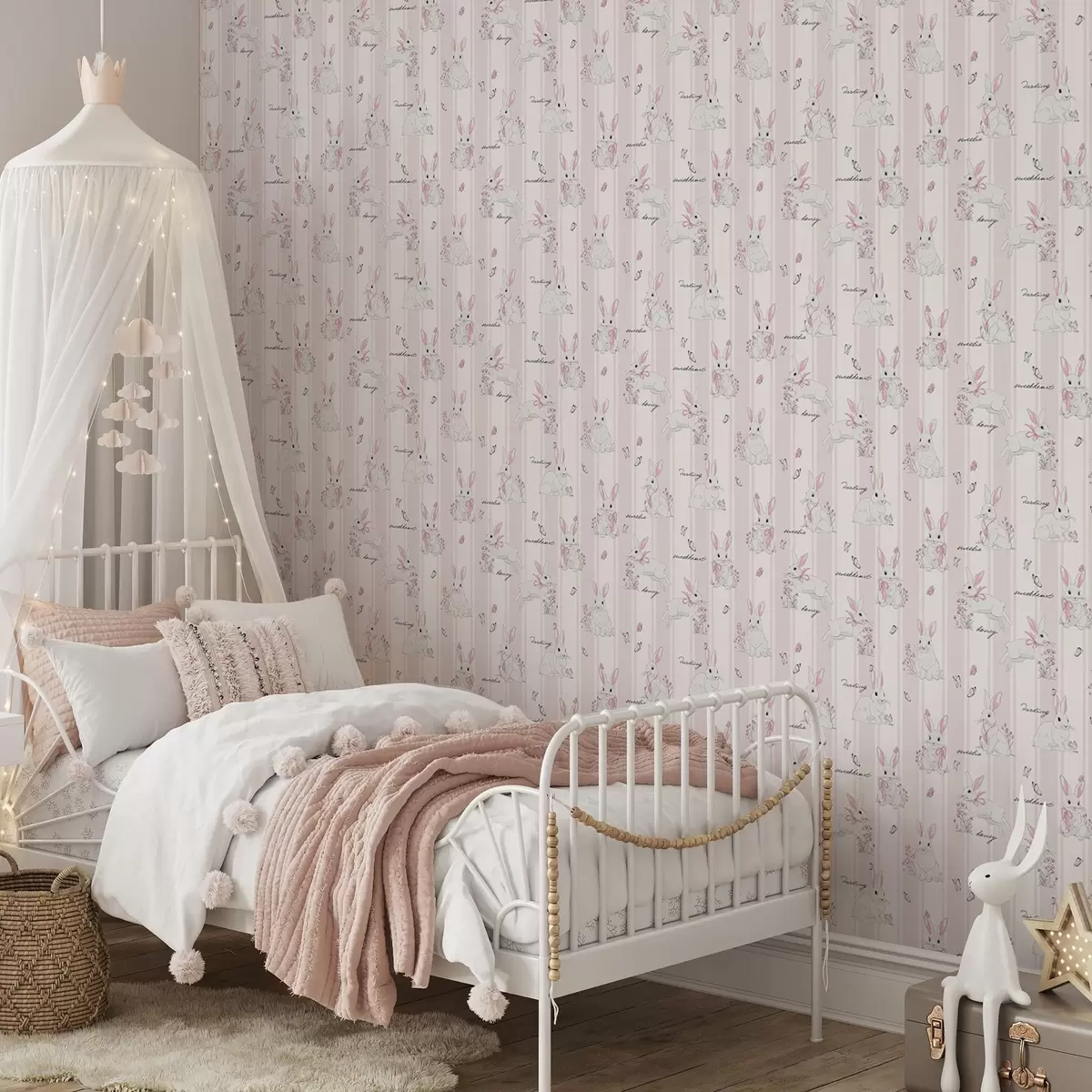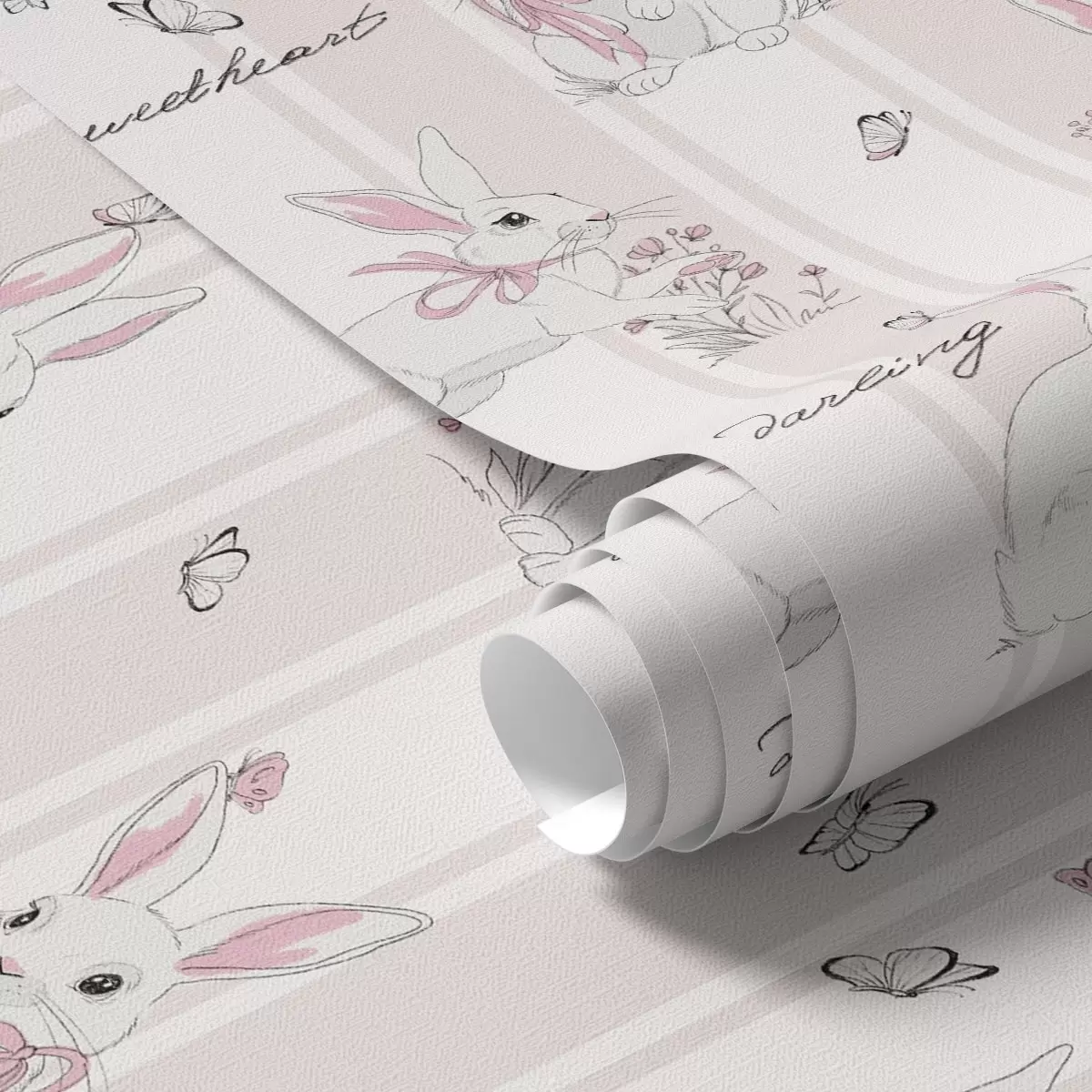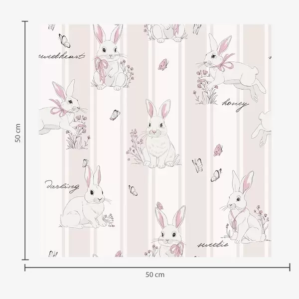 Tapéta Nyuszik masnival, rózsaszín csíkokkal és kis betűkkel Nr. a00657