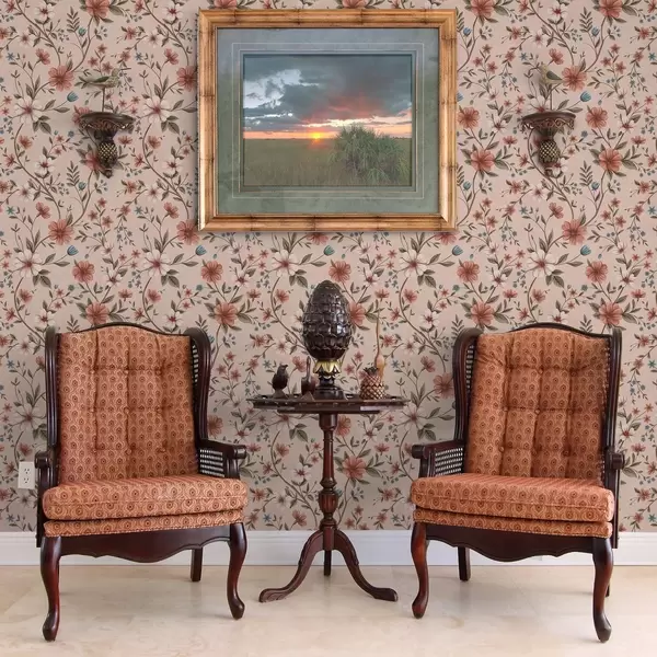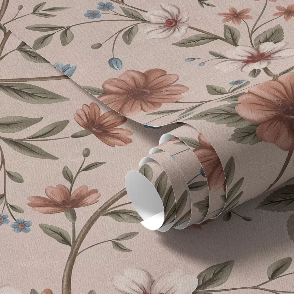 Tapéta Rózsaszín-korall virágok és lombozat poros rózsaszín alapon Nr. a00667