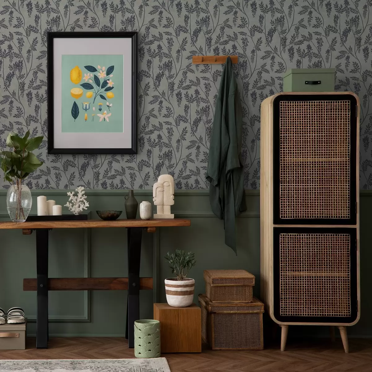 Tapéta Szürke-bézs háttér előtt sötét virágokkal díszített ágak Nr. a00672