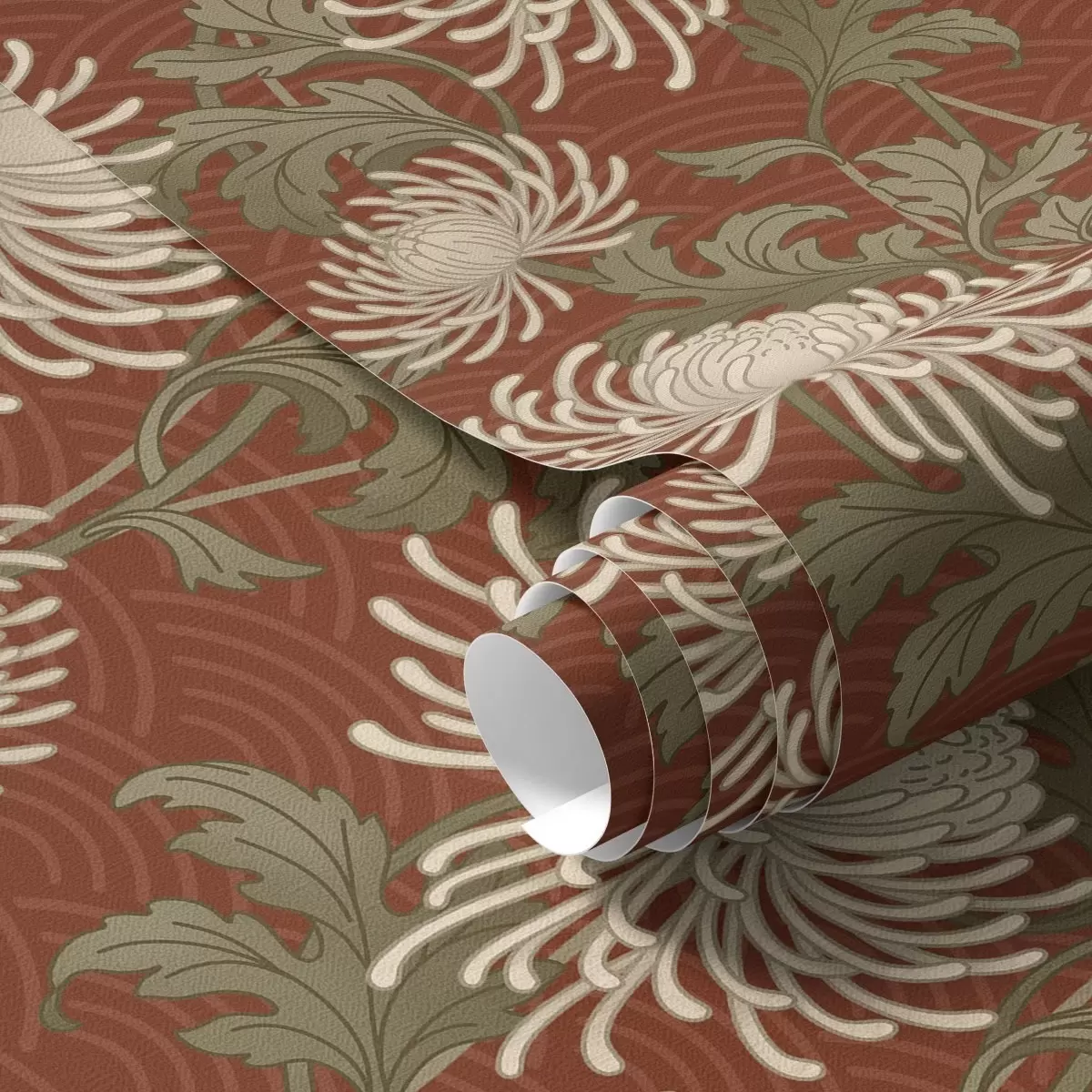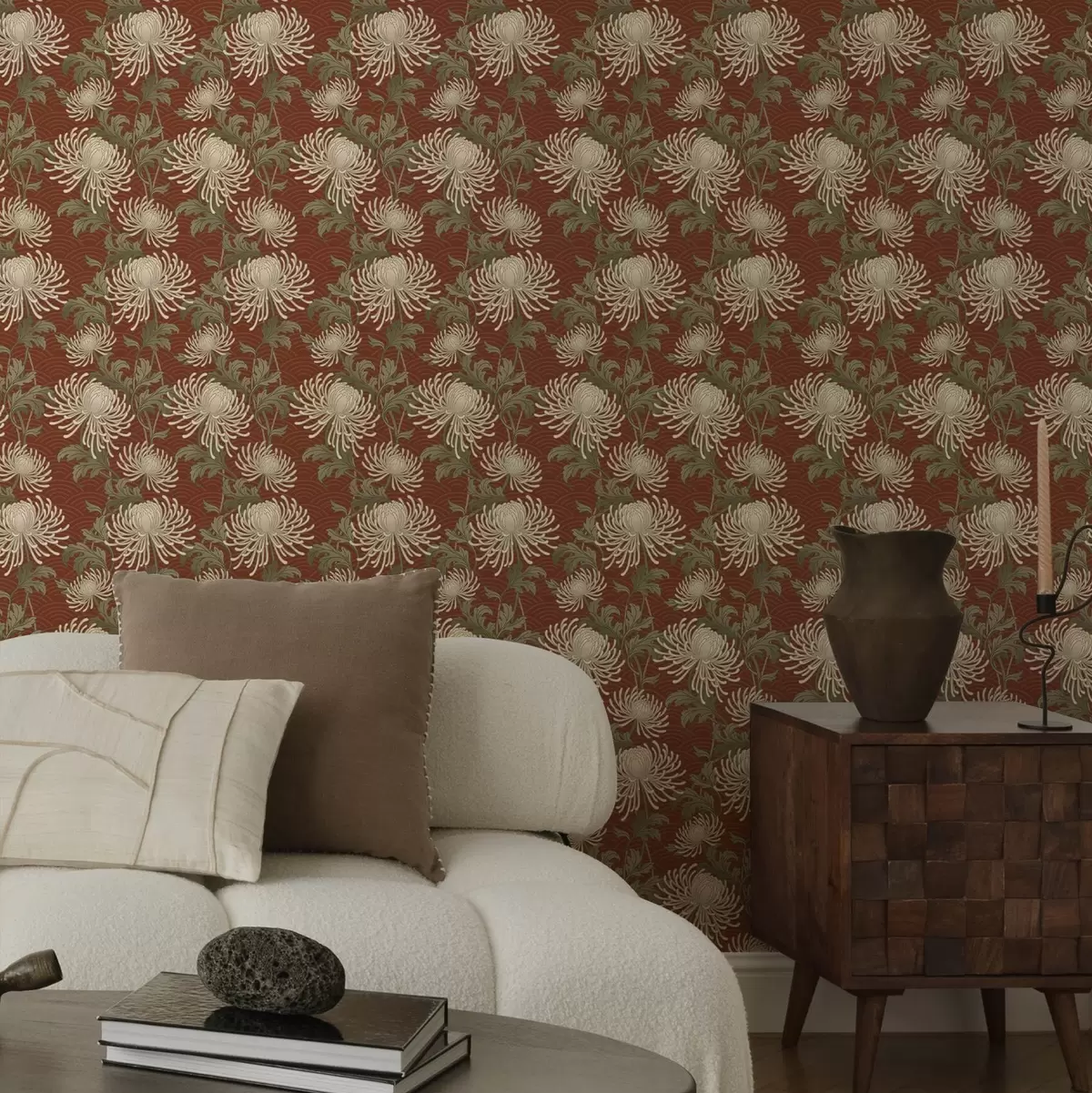 Tapéta Krémes krizantémok terrakotta háttérrel, ázsiai stílusban Nr. a00693