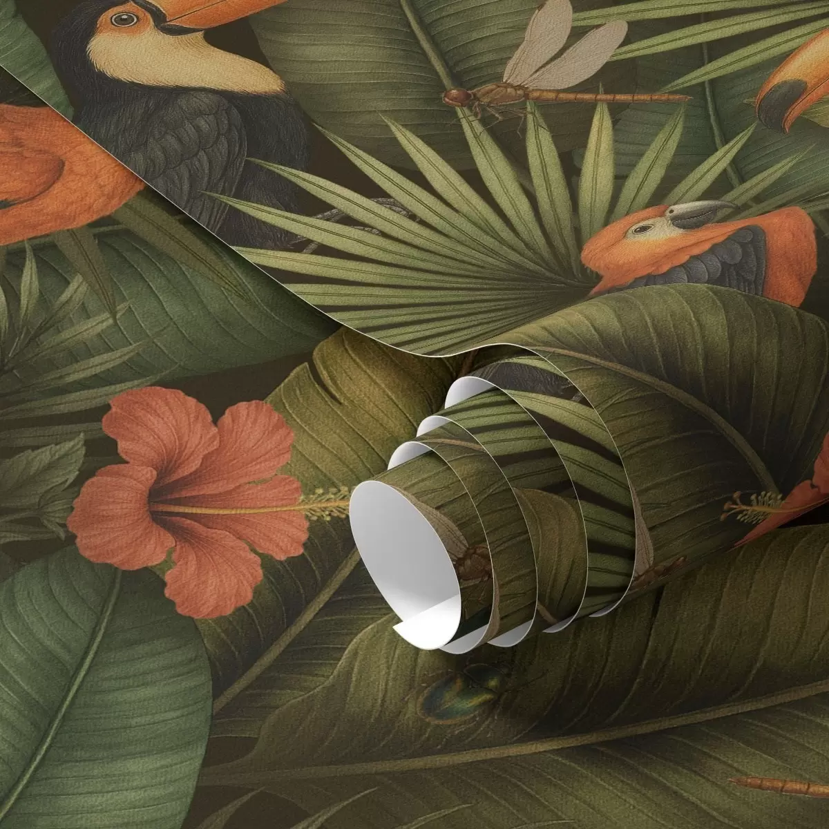 Tapéta Tukánok és papagájok trópusi lombozat és virágok között Nr. a00702