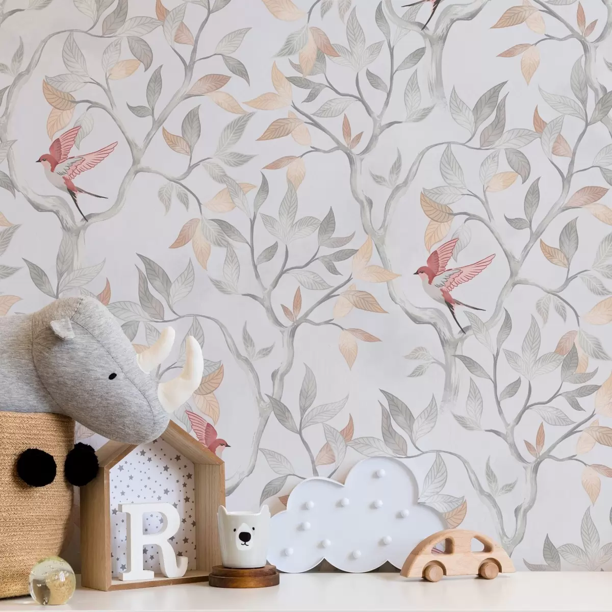 Tapéta Könnyű ágak levelekkel és madarakkal barack színben Nr. a00716