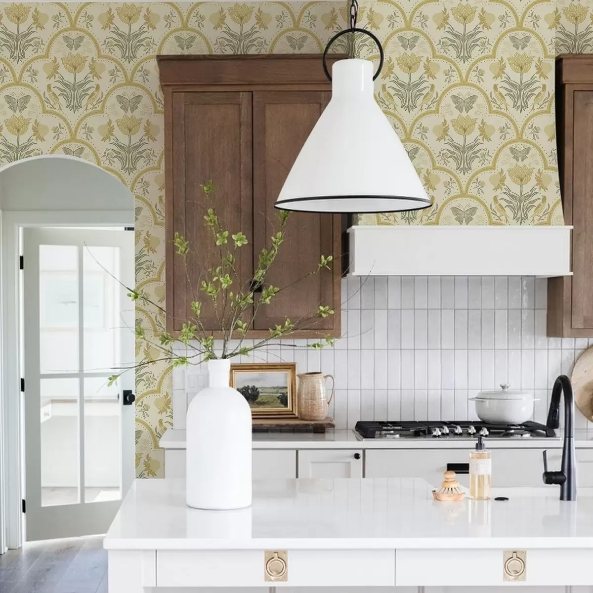 Tapéta Tulipán, madarak és pillangók díszítéssel, okker Nr. a00722