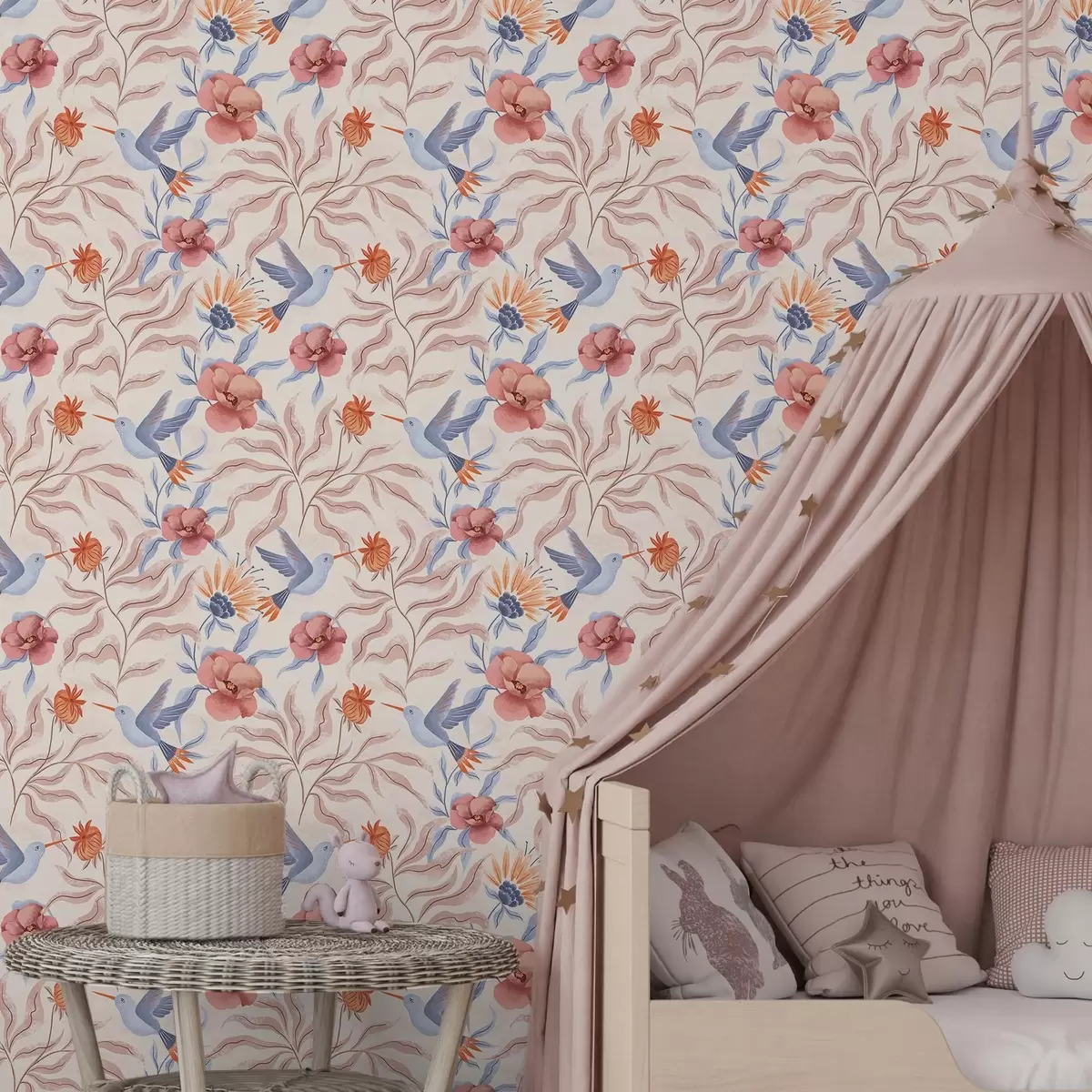 Tapéta Kolibrik rózsaszín és kék árnyalatú nagy virágok között Nr. a00733