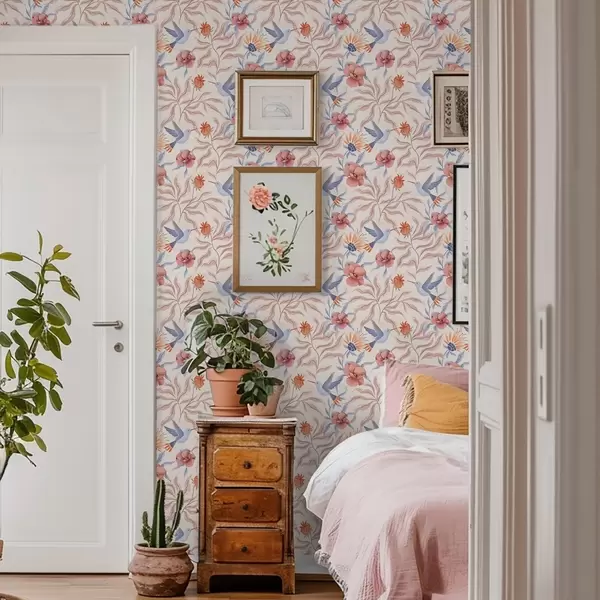 Tapéta Kolibrik rózsaszín és kék árnyalatú nagy virágok között Nr. a00733