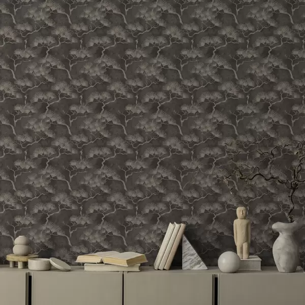 Tapéta Sötét háttér előtt látható fenyőfa sziluettek, ködös textúra Nr. a00742
