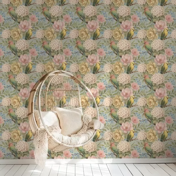 Tapéta Papagájok pünkösdi rózsák, hortenzia és magnólia között Nr. a00747