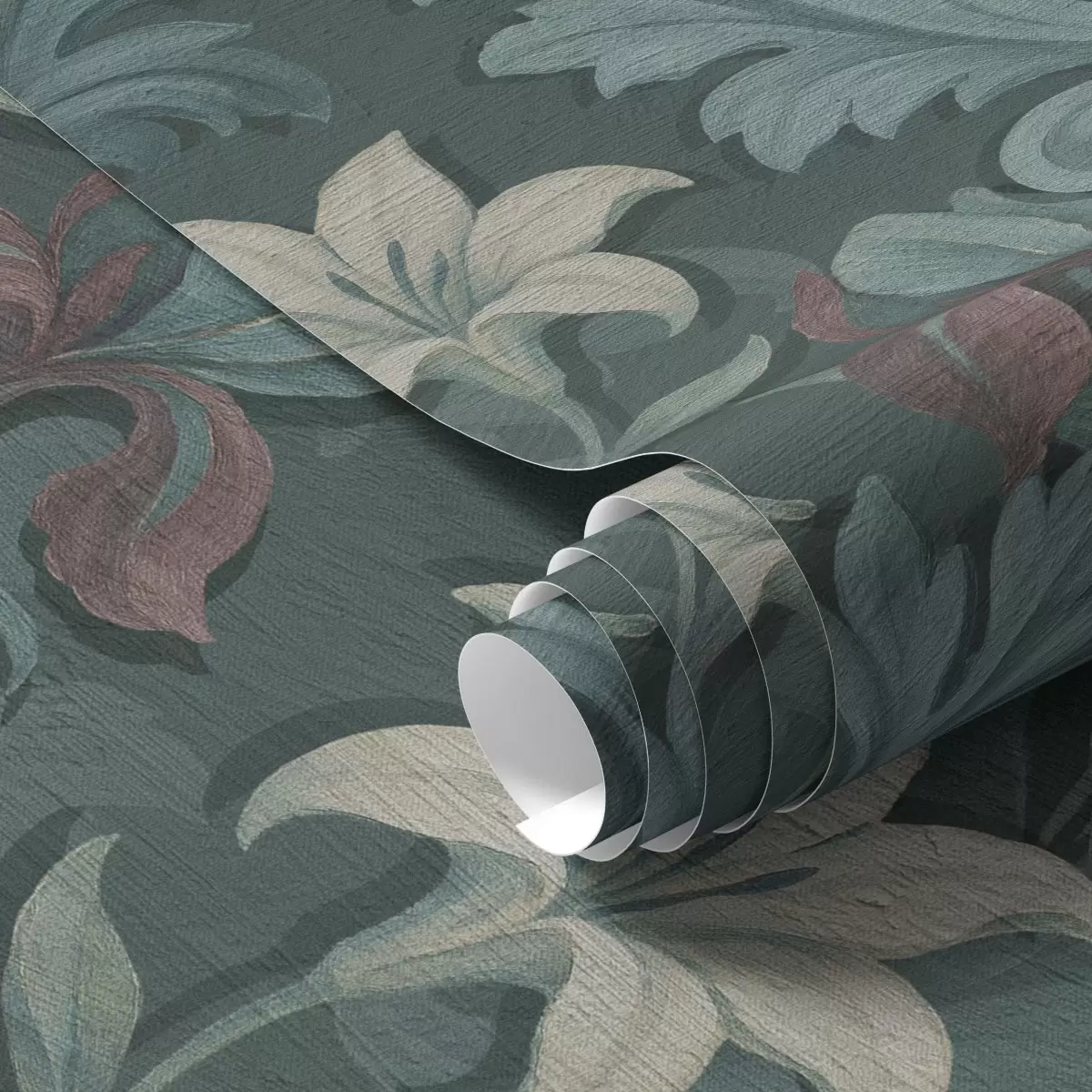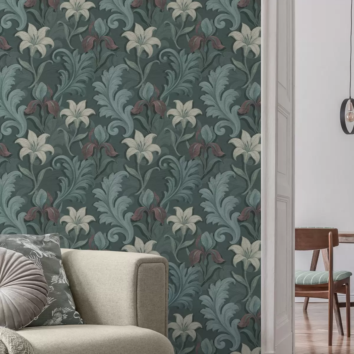 Tapéta Sötétzöld háttér íriszekkel és díszítő levelekkel Nr. a00755