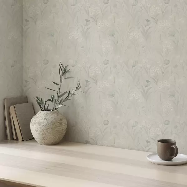 Tapéta Gyengéd rét tulipánokkal és margarétákkal, pasztell zsálya Nr. a00779