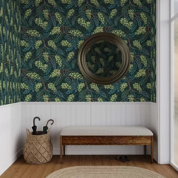 Tapéta Zöldes virágzatú ágak sötét háttér előtt Nr. a00786